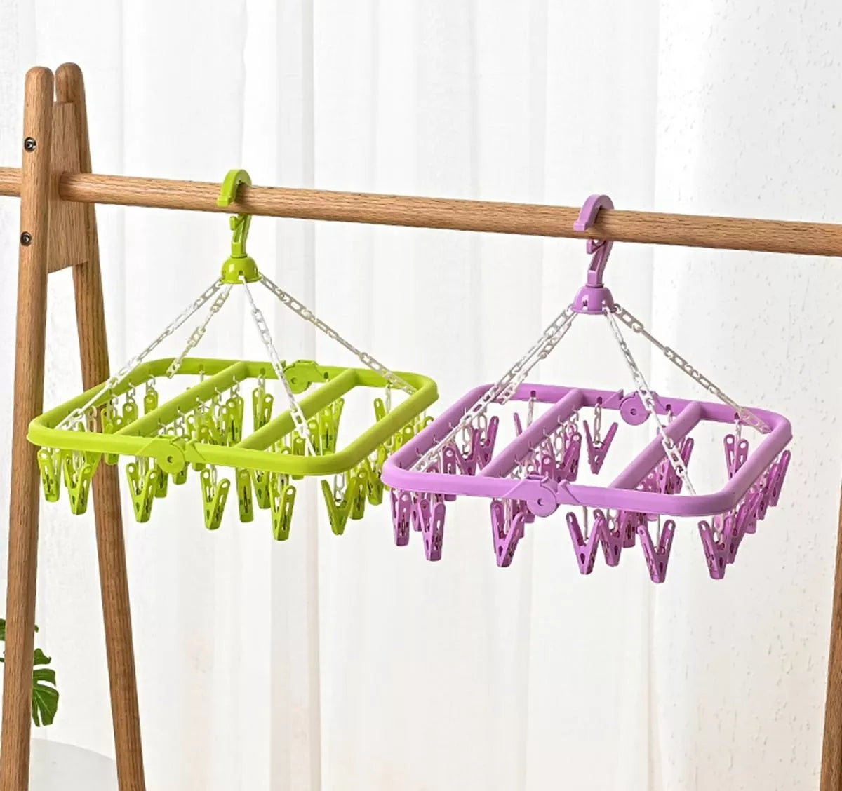 Convenient, compact underwear and sock dryer. Equipped with a handy hook for hanging on hangers and railings. It features up to 32 clips/hooks arranged in multiple rows, making it easy to hang laundry in tight spaces. Sturdy plastic ensures long and hassle-free use.