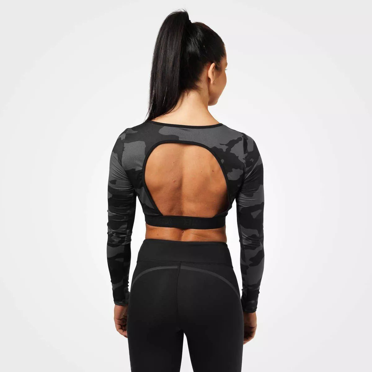 Better Bodies Chelsea Cropped Top (dark camo) - a very comfortable, stretchy women's top. Fits the body perfectly. With long sleeves and an open back. Be exceptional!