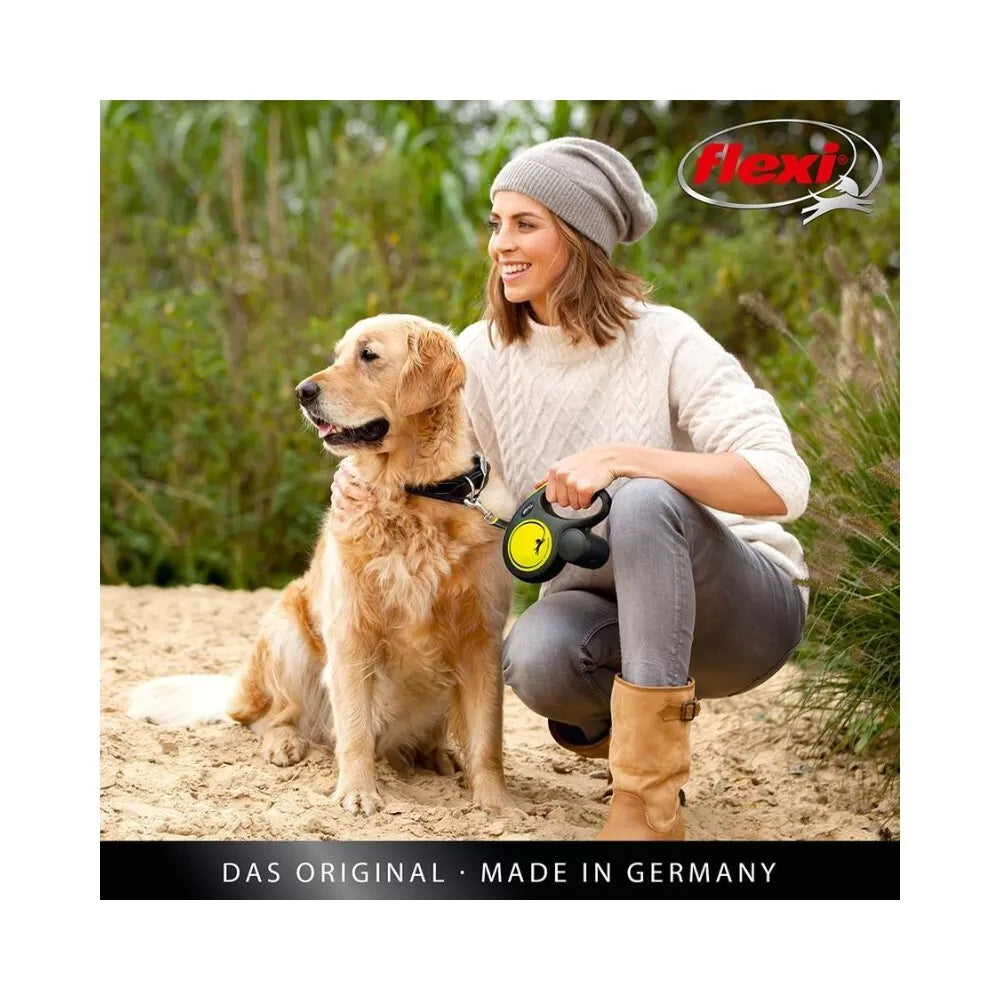 Automatic retractable leash, 5m long, for dogs up to 20 kg. Features a chromed metal carabiner for easy attachment to your dog's collar. Includes the new patented "Short-stroke" braking system with a shorter stroke length. Additionally, the leash has reflective side panels and a neon-colored tape, making walks during dark hours much safer. The automatically adjustable leash length allows your pet more freedom of movement.