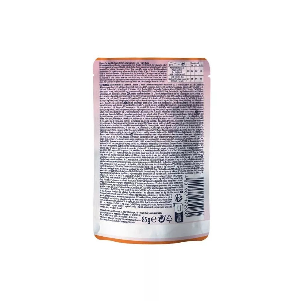 Support the harmonious growth of young kittens. Happy Cat Meat in Sauce Kitten & Junior contains high-quality meat. Easily digestible goulash with duck and delicious sauce is specially adapted to the needs of small kittens. This delicious complete food contains everything needed for harmonious kitten growth. Complete food for young kittens from 2 to 12 months. Grain-free formula. Also suitable for neutered cats. Ingredients: meat and animal derivatives (poultry 40%, of which duck 10%), derivatives of vegetable origin (apple pomace 0.3%), minerals, seeds (linseed 0.03%), inulin 0.1%. Analytical constituents: crude protein 8.5%, crude fat 5.5%, crude fibre 0.5%, crude ash 2.0%, moisture 82%, calcium 0.28%, phosphorus 0.19%. Additives: Vitamins/kg: Vitamin D3 (3a671) 250 IU, Vitamin E (3a700i) 15 mg, Biotin (3a880) 20 mcg, Taurine (3a370) 445 mg. Trace elements/kg: Manganese (3b503) 1 mg, Zinc (3b605) 15 mg, Copper (3b405) 1 mg. Feeding recommendations: see table on packaging. The daily amount is indicative and may vary depending on the pet's age, breed, and activity. The pet must always have fresh water. Serve the goulash at room temperature. 1 pouch of goulash corresponds to approx. 20 g of dry food. Store in a dry, cool place away from direct sunlight. Best before/Batch No./Net quantity/Manufacturer: see on packaging. Product images are for illustrative purposes only. The product description is general and not all features may be mentioned. Information on the product packaging is more detailed. We recommend following the information on the product packaging.