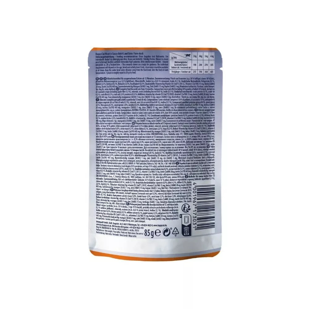 "Happy Cat Meat in Sauce" Duck Goulash is carefully prepared with high-quality meat and a delicious sauce. The goulash helps maintain healthy urinary tracts and is suitable for sterilized cats.
