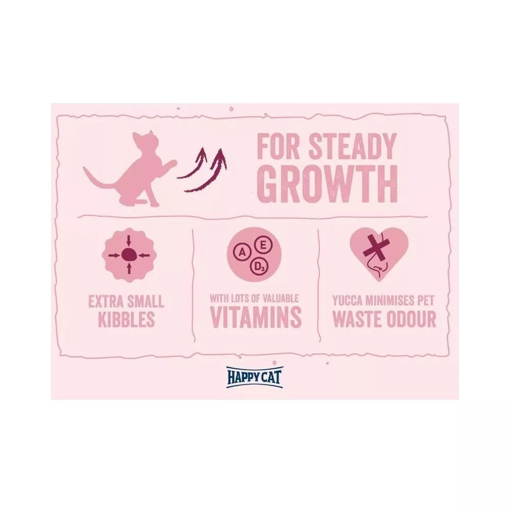 Happy Cat Minkas Kitten Care, with valuable proteins and premium ingredients such as Omega-3 and Omega-6 fatty acids, ensures complete harmonious growth – 100% balanced and natural. The formula with delicious poultry is specially adapted to the needs of young cats. This complete food is ideal for kittens from 5 weeks old and provides them with everything they need. This dry food is rich in vitamins, and the mineral content is adapted to support your cat's growth. It also strengthens the immune system. The formula is naturally free from artificial flavors and preservatives.