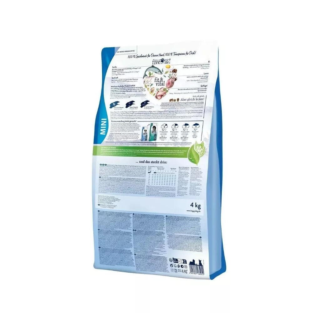 Happy Dog fit & vital Mini Puppy - specially balanced complete food for puppies from the first month of life. Wheat-free formula. The dry food contains five specially selected, high-quality animal proteins – well-tolerated lamb, easily digestible poultry, hearty beef, fish, and eggs, ensuring balanced growth and optimal development. Valuable New Zealand mussels promote healthy growth and development of bones, tendons, ligaments, and joints. Omega 3 and Omega 6 fatty acids (from fish and flaxseed) contribute to a shiny coat and healthy skin. The puppy's immune system is also supported with Vitamin C in the food.