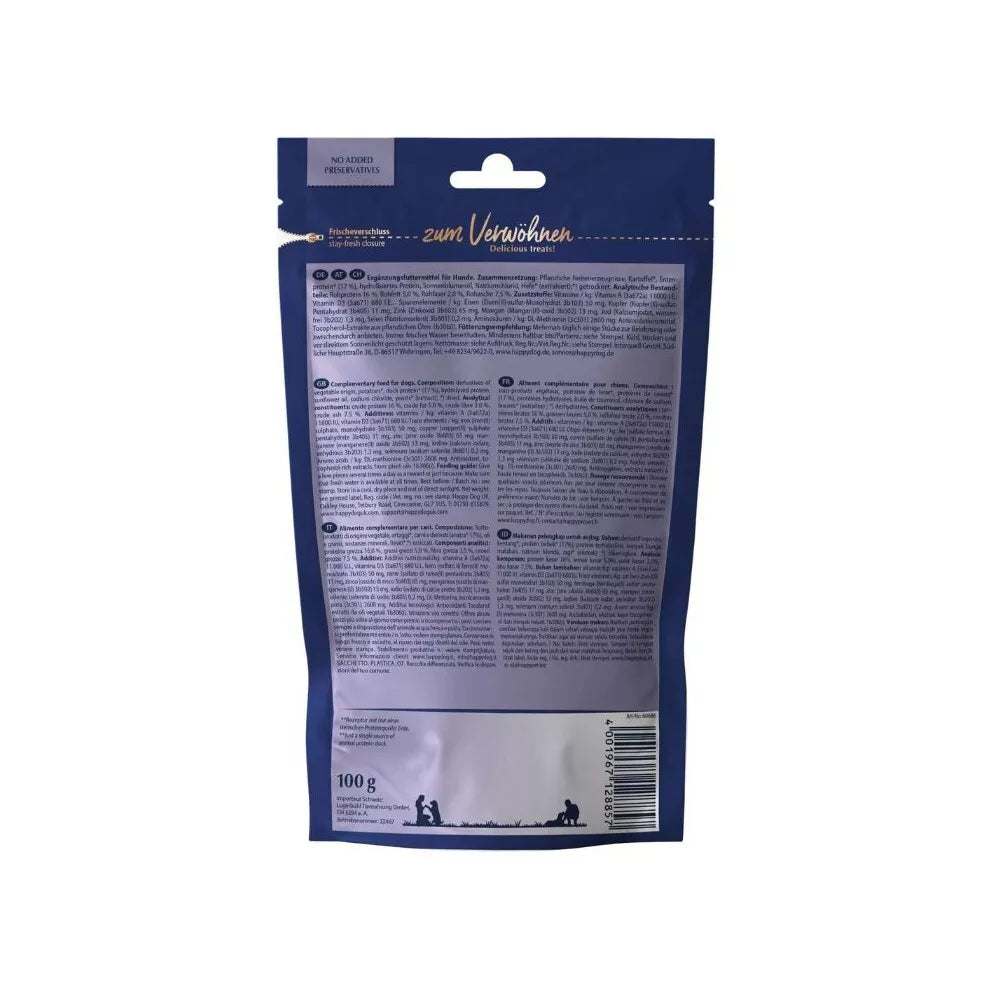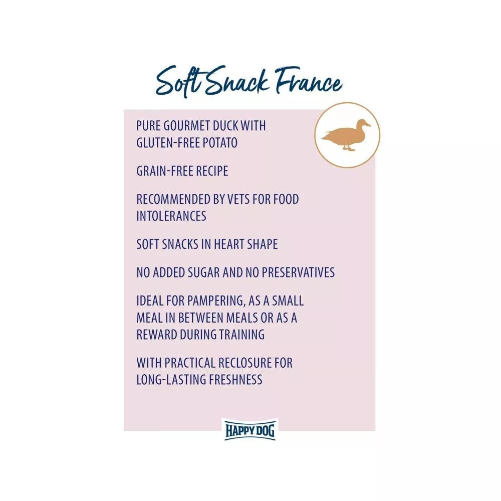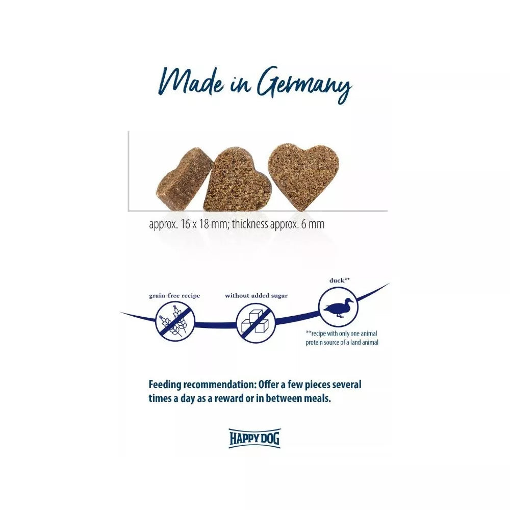 Dietary supplement for adult dogs.Looking for a delicious and healthy treat for your dog? Happy Dog France – these are high-quality duck treats that are perfect for sensitive dogs or dogs with food intolerances.Key Features:🦆 With Duck – an exceptionally digestible protein source, perfectly suited for allergic and sensitive dogs.🌾 Grain- and Gluten-Free – a safe choice even for the most sensitive pets.🇩🇪 Made in Germany – guaranteed quality and strict ingredient control.🐶 Ideal as a reward – small pieces are perfect for training or as a snack between meals.Benefits for Your Pet:✅ Supports the digestive system – thanks to its easily digestible formula.✅ Hypoallergenic Formula – a single protein source reduces the likelihood of allergic reactions.✅ No Artificial Additives – no added sugar, preservatives, or colorants.This highly healthy and easily digestible snack with delicious duck and gluten-free potatoes is ideal for dogs of all sizes who have sensitive digestion or are picky eaters. The treats are easy to break into smaller pieces, making them perfect for training or simply as a reward. The bag is conveniently resealable to keep treats fresh for longer, plus they are preservative-free and sugar-free.Ingredients: Vegetable products, potatoes, duck protein (17%), hydrolyzed protein, sunflower oil, sodium chloride, yeast (extract).Analytical Constituents: Crude protein 16.0%, crude fat 5.0%, crude fiber 2.0%, crude ash 4.5%, moisture 14.0%. Additives/1 kg: Vitamins: Vitamin A (3a672a) 11000 IU, Vitamin D3 (3a671) 680 IU. Trace elements: Iron (iron (II) sulfate, monohydrate 3b103) 50 mg, Copper (copper (II) sulfate pentahydrate 3b405) 11 mg, Zinc (zinc oxide 3b603) 65 mg, Manganese (manganese (II) oxide 3b502) 13 mg, Iodine (calcium iodate, anhydrous 3b202) 1.3 mg, Selenium (sodium selenite 3b801) 0.2 mg. Amino acids: DL-methionine (3c301) 2600 mg. Antioxidants: Tocopherol extract from vegetable oils 1b306(i).Feeding Recommendations: Give a few pieces per day as a treat to supplement the daily diet. Your pet should always have fresh water available. Store in a cool, dry place, protect from direct sunlight. Best before/Batch number/Manufacturer: see on packaging.Product photos are for illustrative purposes only. The product description is general in nature and not all features may be mentioned. Information on the product packaging is more detailed. We recommend relying on the information provided on the product packaging.