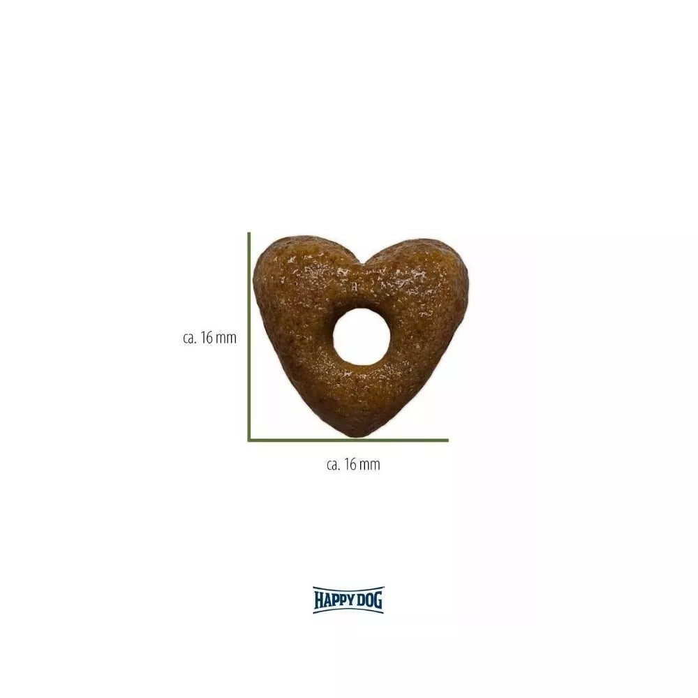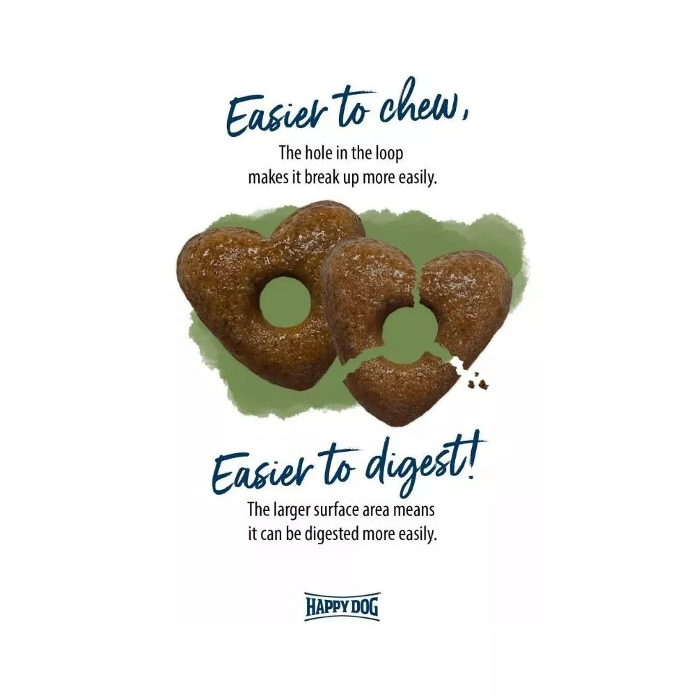 All Happy Dog Young products are made in a heart shape with a hole in the middle. The goal is to create easily digestible dog food. Due to the hole, the small pieces break down faster during chewing – making it easier for your dog to chew. The larger surface area also allows digestive juices to better envelop the food in the stomach.