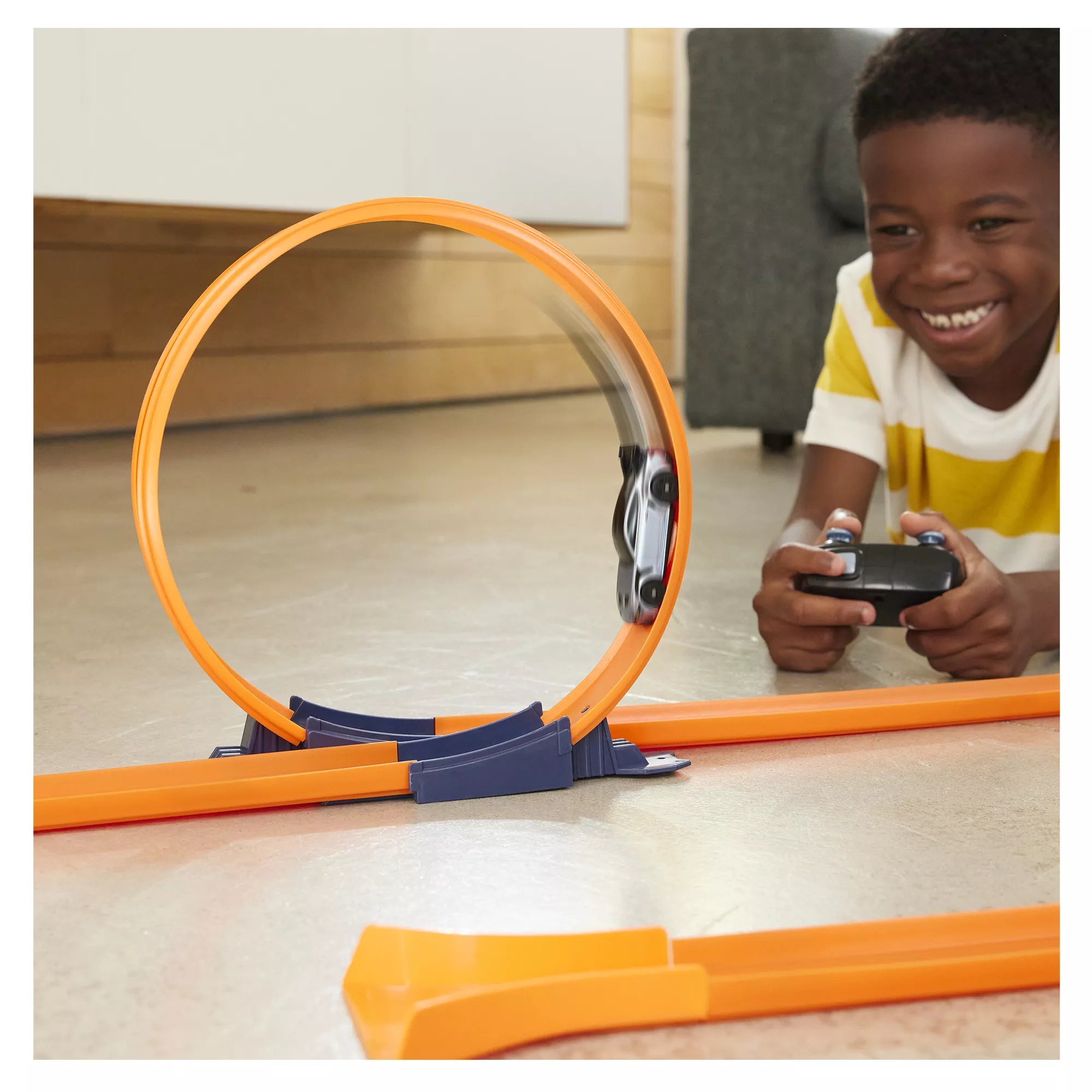 · This 1:64 scale RC model can also be driven on "Hot Wheels" orange tracks, and the set includes a special adapter for track entry.
