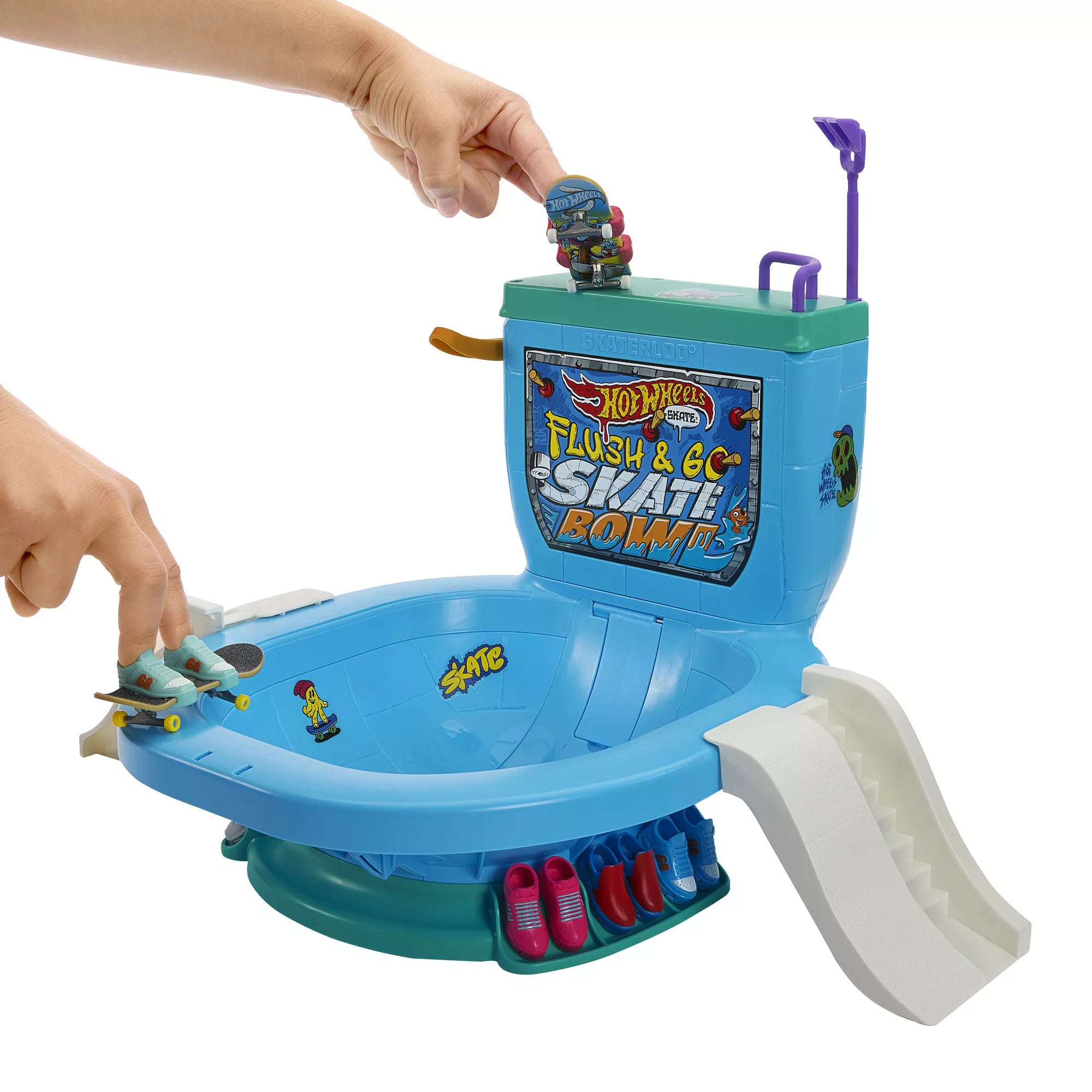Insert the skateboard into the specially designated spot on top of the tank, press the release handle, and watch the skateboard race inside the playset.