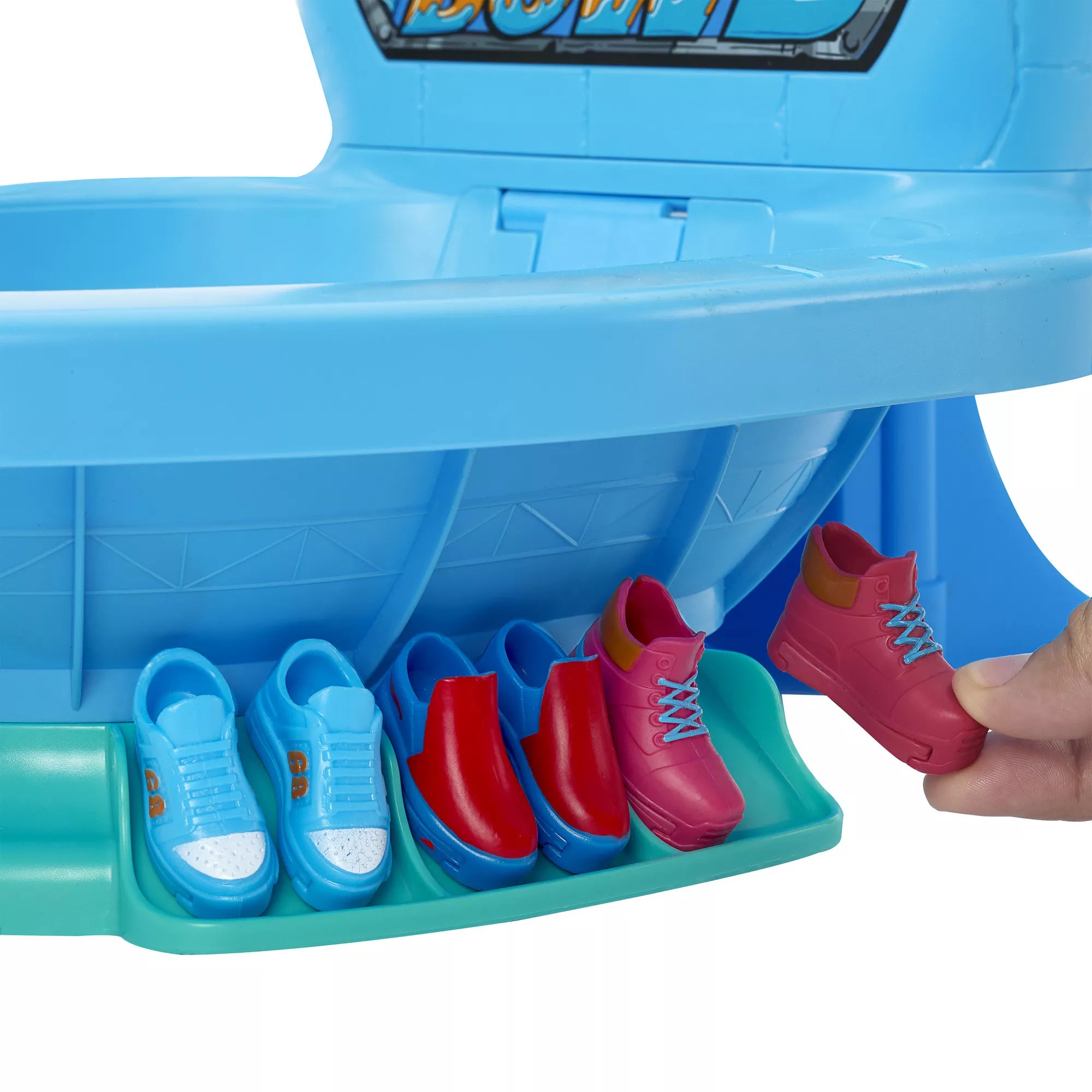 The playset can store 3 skateboards and 5 pairs of shoes.