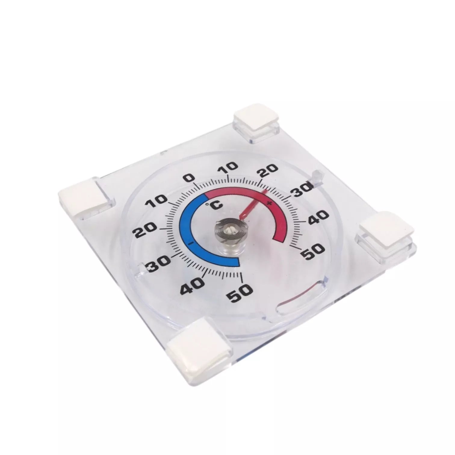The thermometer is made of clear plastic, making it resistant to environmental influences and ensuring it doesn't obstruct the view through the window. The clear scale design with blue and red zones allows for quick and convenient temperature readings.