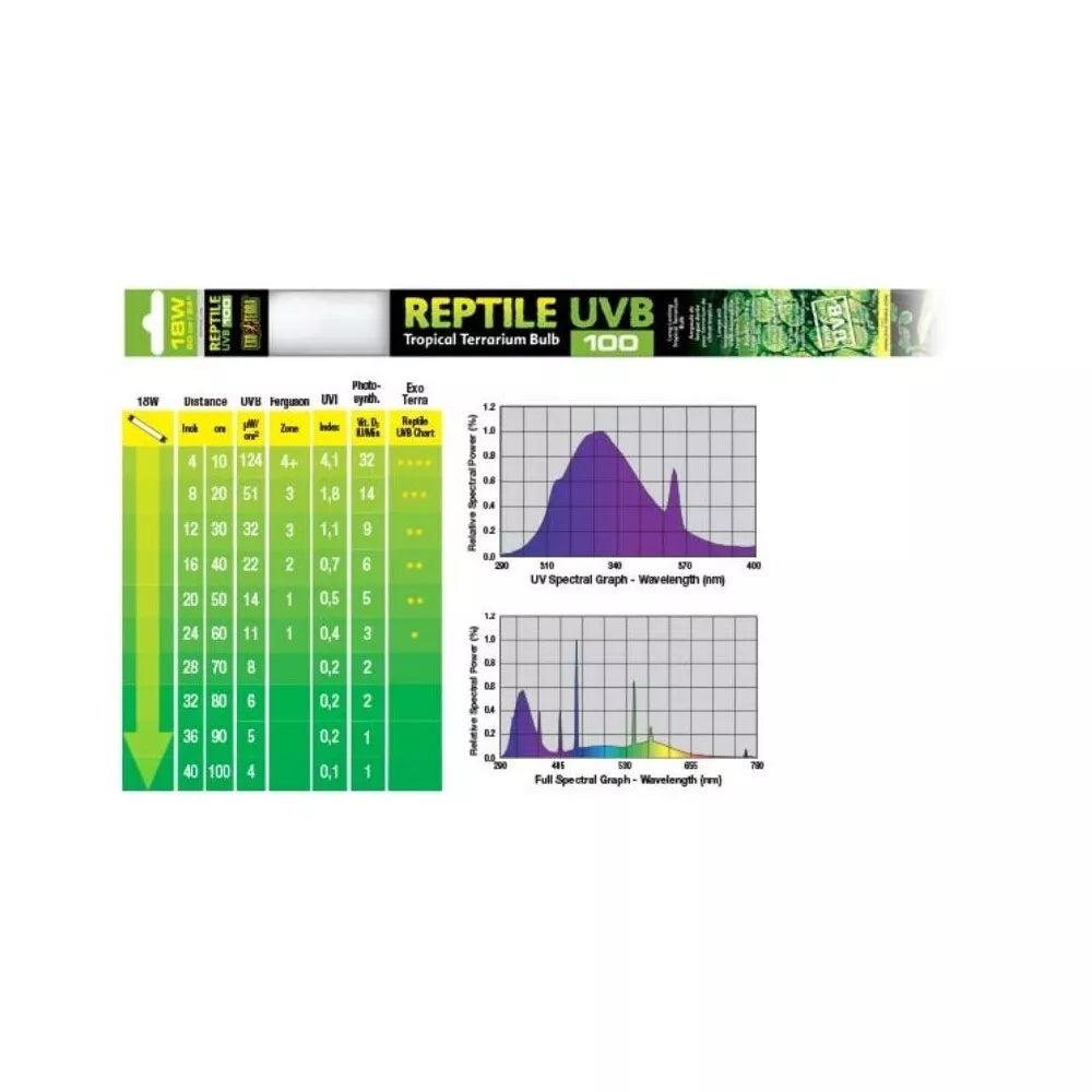 Exo Terra Reptile UVB100 emits optimal UVB levels, similar to those found in tropical and subtropical environments. Reptiles living in these habitats receive moderate UV radiation due to climate conditions (e.g., high humidity, weather changes). The optimal Vitamin D3 synthesis aids calcium absorption, preventing metabolic bone disease and other disorders.