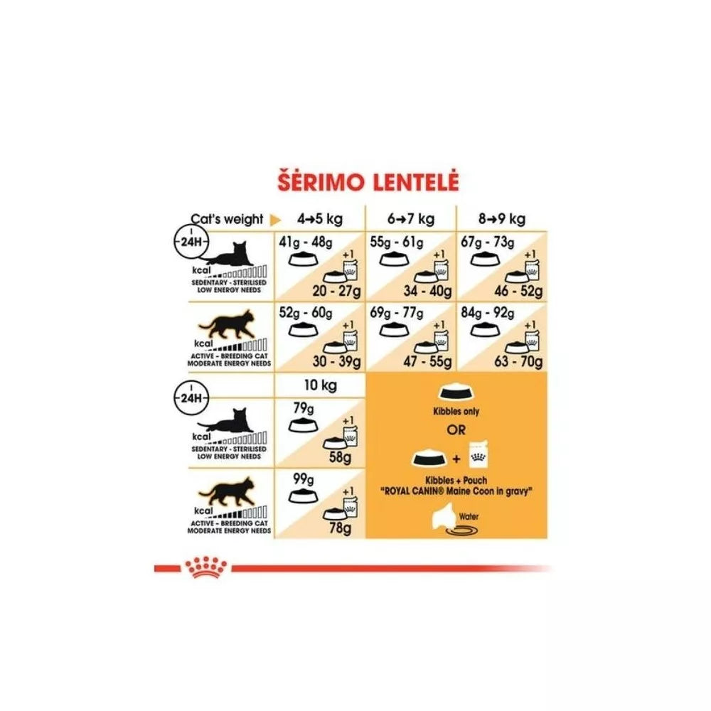 Royal Canin Maine Coon Adult complete dry food for Maine Coon cats. The food's composition is chosen by analyzing the needs for maintaining healthy joints, a strong heart, a shiny coat, and healthy skin. Adult cats of this breed are quite large, so the food kibbles are specially adapted for comfortable eating, to help clean plaque from teeth as they eat, and to prevent tartar formation. Omega-3 and omega-6 fatty acids support healthy bones and joints, which is very important for large breed cats. The special food composition, along with the vitamins and minerals it contains, helps maintain a strong heart. It contains taurine, eicosapentaenoic acid (EPA), and docosahexaenoic acid (DHA). The food helps maintain a full and shiny coat, and healthy skin. Kibble size is adapted for Maine Coon jaws. INGREDIENTS: dehydrated poultry protein, rice, corn, animal fats, corn gluten, vegetable fibers, vegetable protein isolate*, beet pulp, hydrolyzed animal proteins, minerals, soybean oil, fish oil, psyllium husks and seeds, fructo-oligo-saccharides, yeast extract (source of manno-oligo-saccharides), borage oil, green tea and grape extracts (source of polyphenols), hydrolyzed crustaceans (source of glucosamine), marigold extract (source of lutein), hydrolyzed cartilage (source of chondroitin). *L.I.P.: proteins selected for their very high digestibility. Analytical constituents: crude protein – 31%, crude oils and fats – 20%, crude ash – 7.2%, crude fiber – 4.7%. Additives: vitamin A – 25200 IU, vitamin D3 – 800 IU, E1 (iron) – 41 mg, E2 (iodine) – 2.9 mg, E4 (copper) – 8 mg, E5 (manganese) – 54 mg, E6 (zinc) – 205 mg, E8 (selenium) – 0.11 mg, L-lysine – 13.5 g, taurine – 3 g, L-carnitine – 50 mg. Preservatives. Antioxidants. Product images are for illustrative purposes only. The product description is general and may not mention all features. Information on the product packaging is more detailed. We recommend referring to the information on the product packaging.