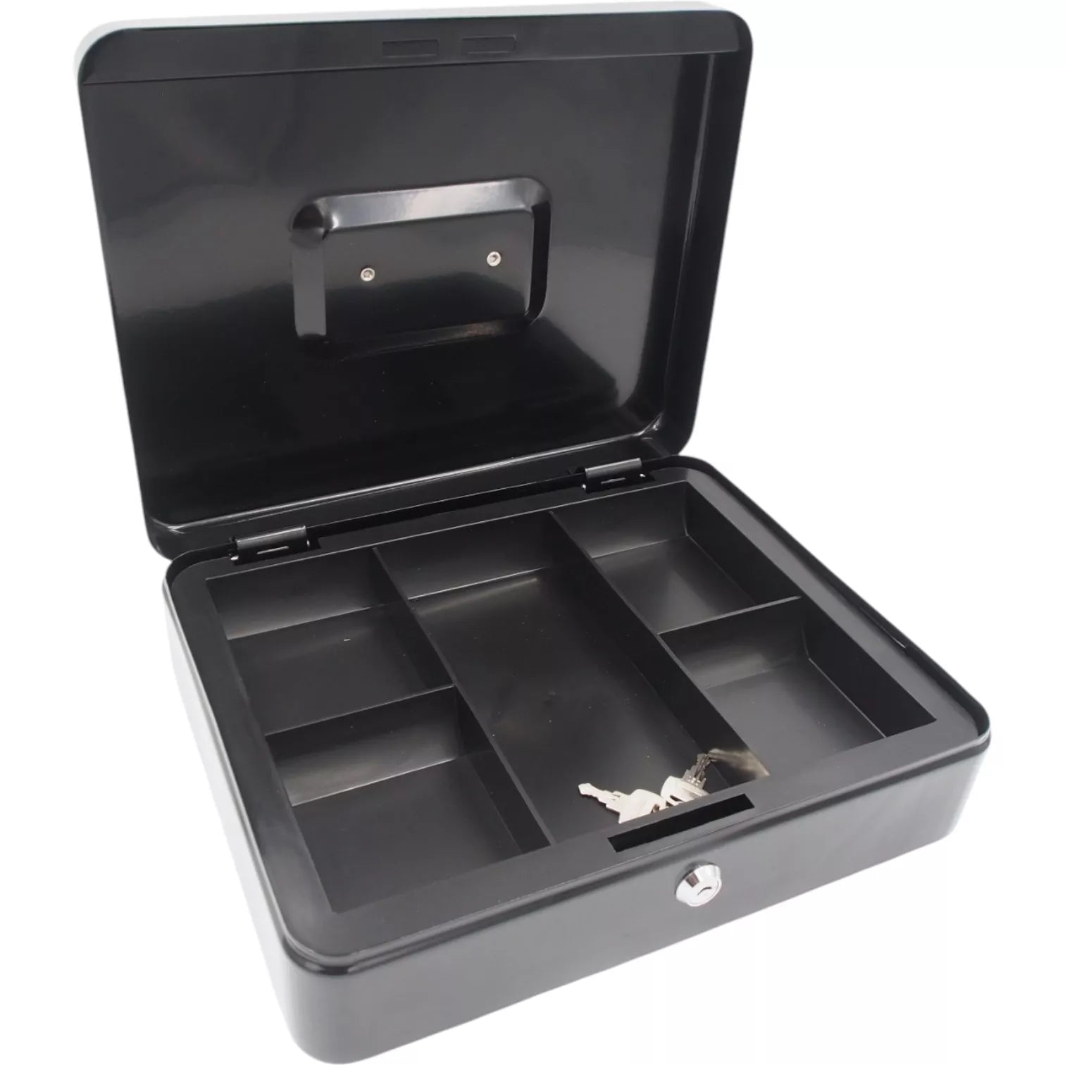 Durable and spacious metal box designed for storing cash, coins, and small documents. The box locks securely and comes with 2 keys. Inside, there is a removable plastic compartment for coins, and below it, you can store banknotes or other documents. A convenient handle is integrated into the lid, allowing for easy transport of the box.