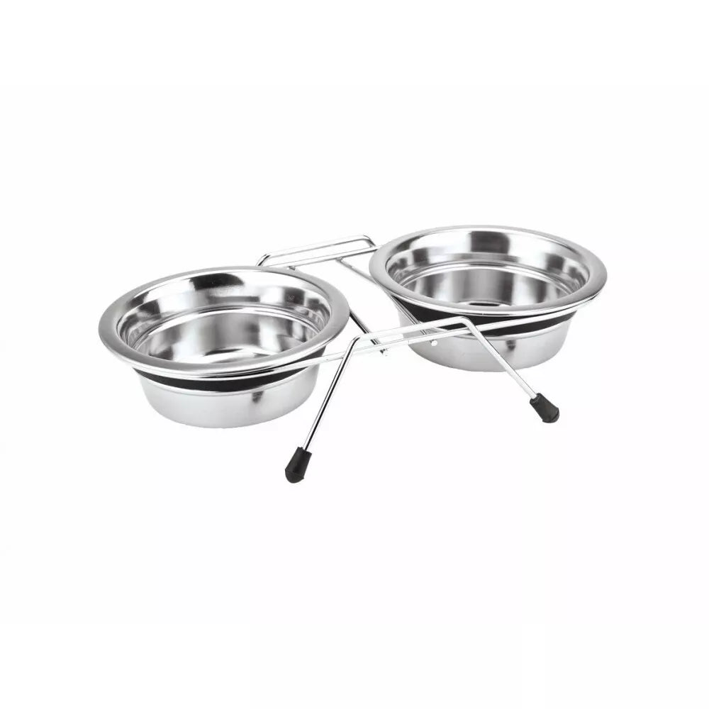 This double pet bowl is designed for food and water, made of scratch-resistant stainless steel. The bowls are easy to clean. The bottom of the bowls features a wide rubber band, preventing them from rattling while your pet eats. The non-slip feet of the stand ensure stability during feeding.