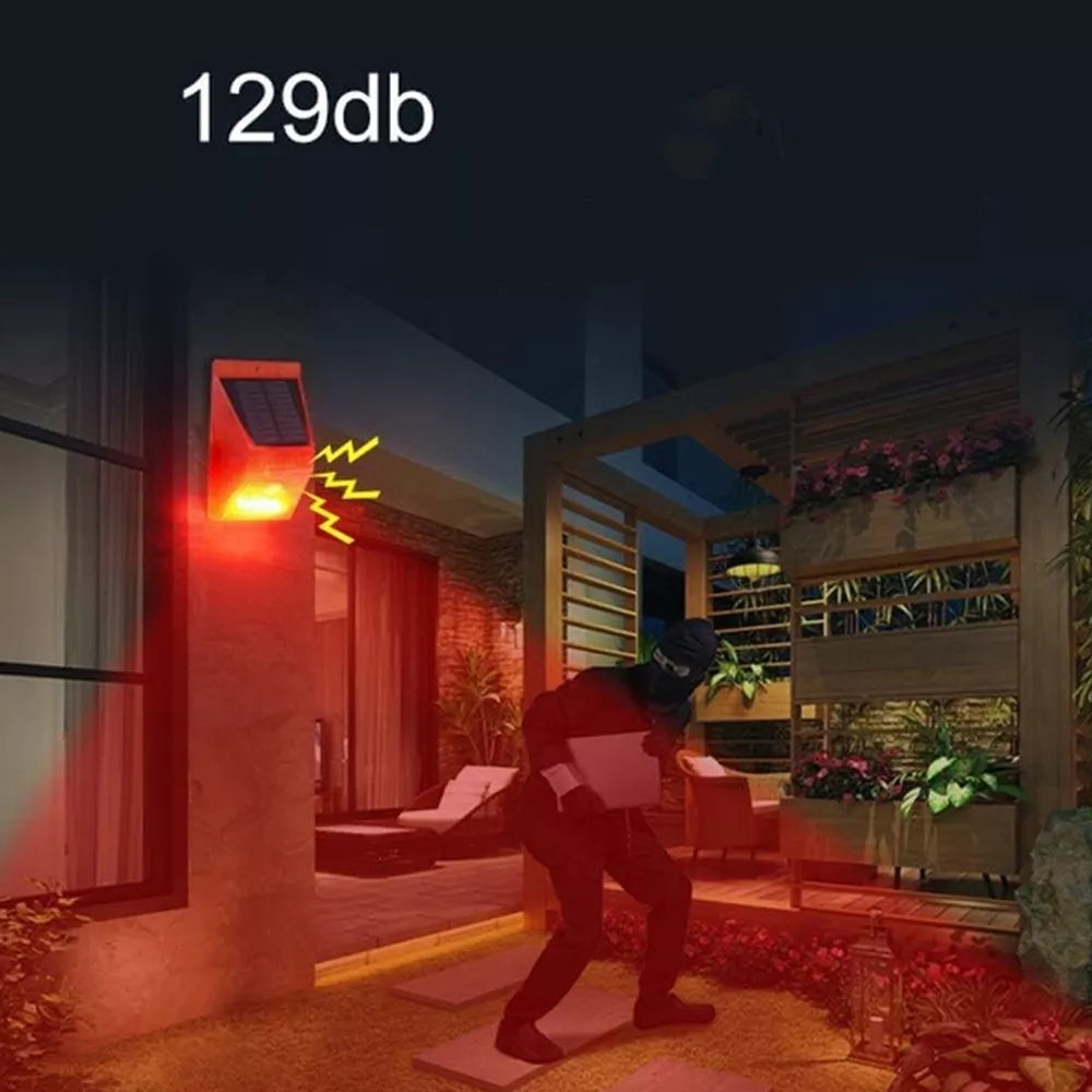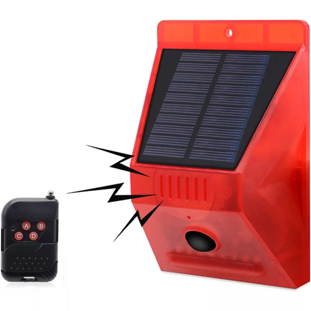 Ensure the safety of your home, farm, garage, or garden with this modern solar-powered alarm system. This bright red alarm system is equipped with a PIR motion sensor, a powerful 129 dB siren, 8 LED lights, and a remote control, making it perfect for deterring unwanted individuals or animals.