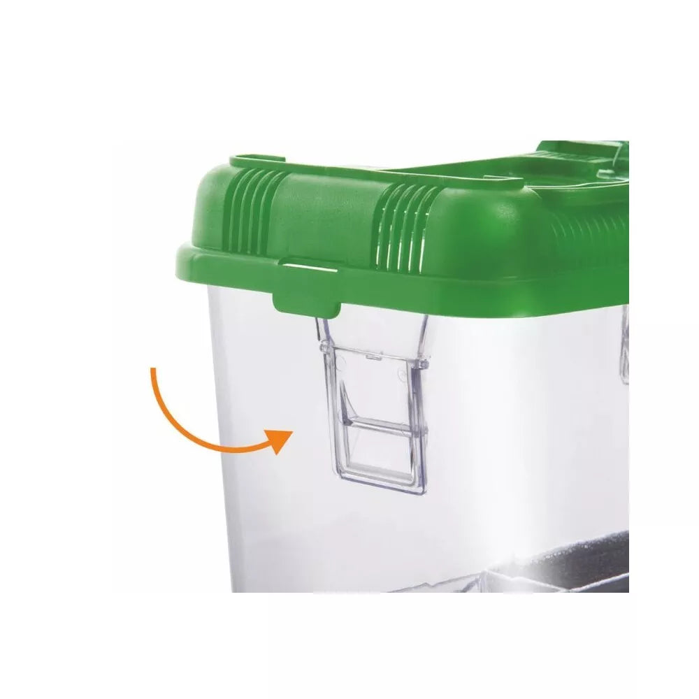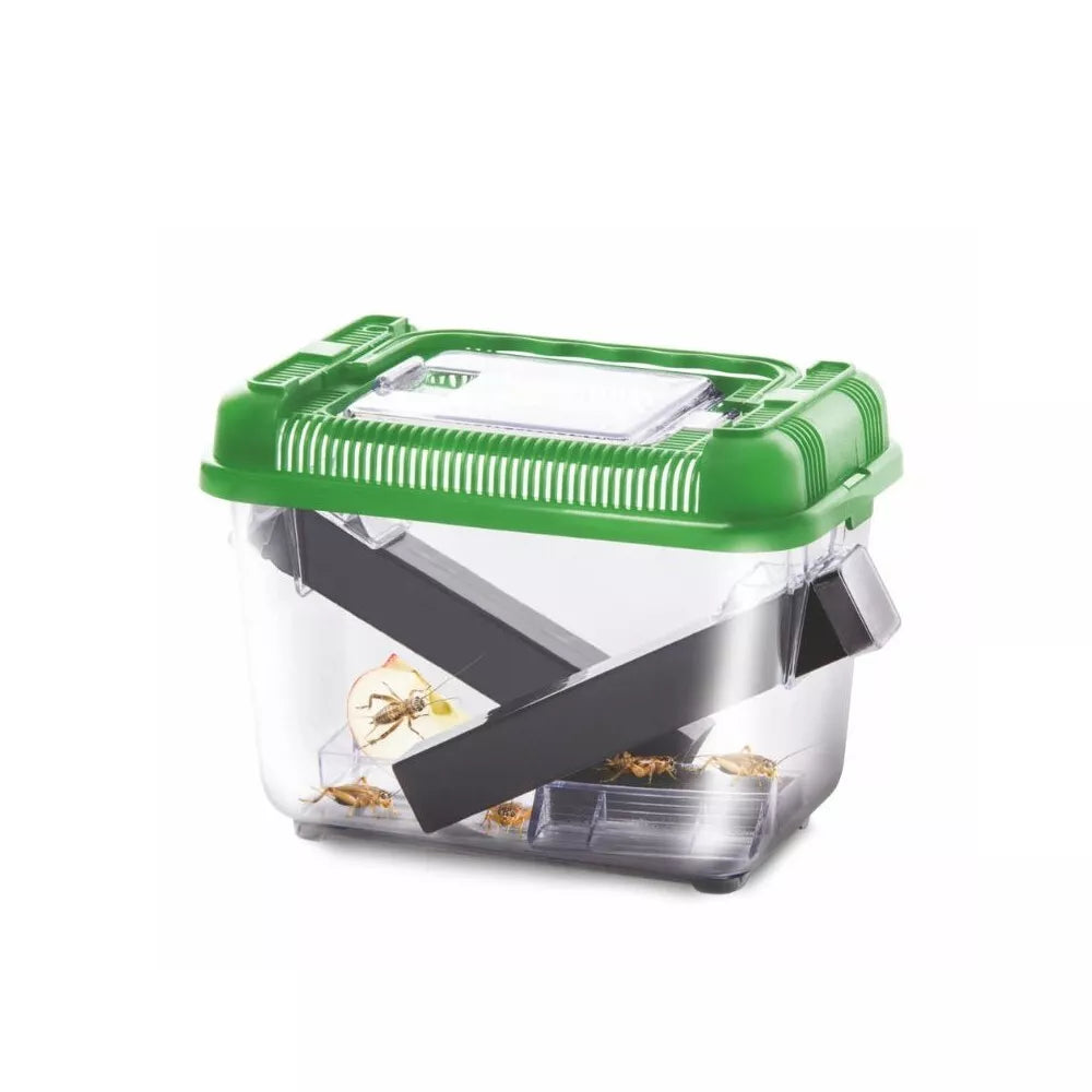 A complete cricket care kit. Features a removable lid with ventilation holes and a door with a handle for easy carrying.