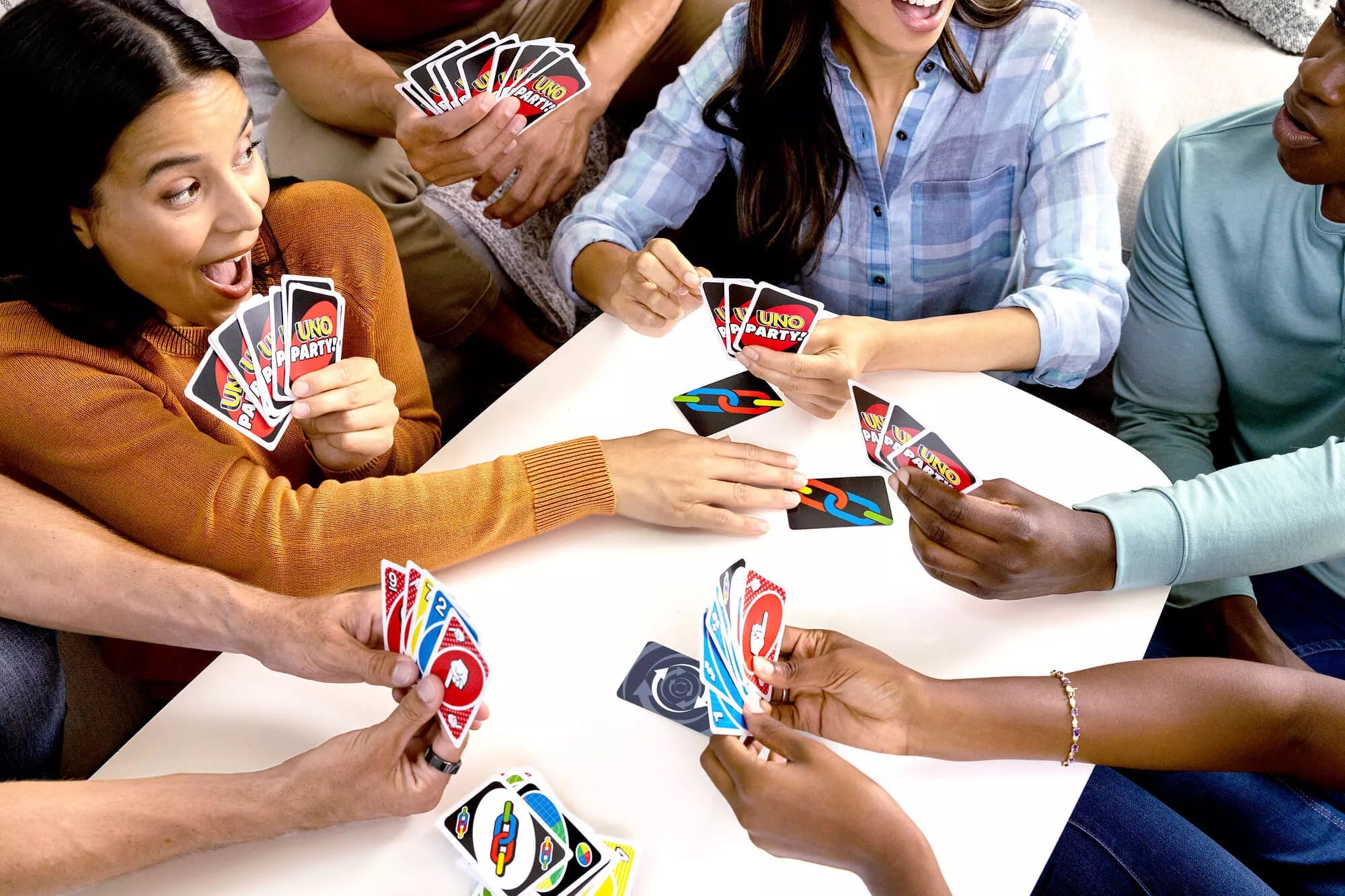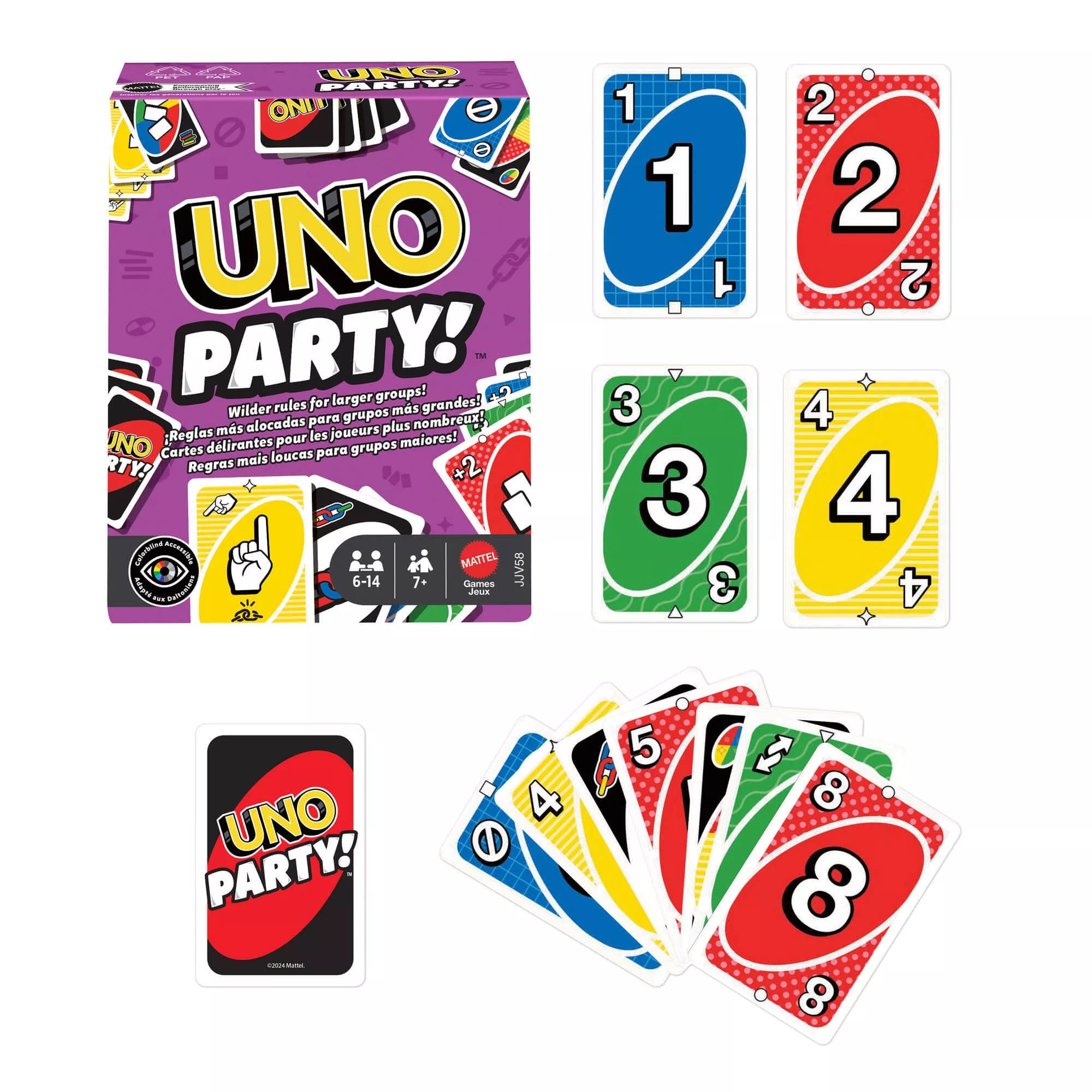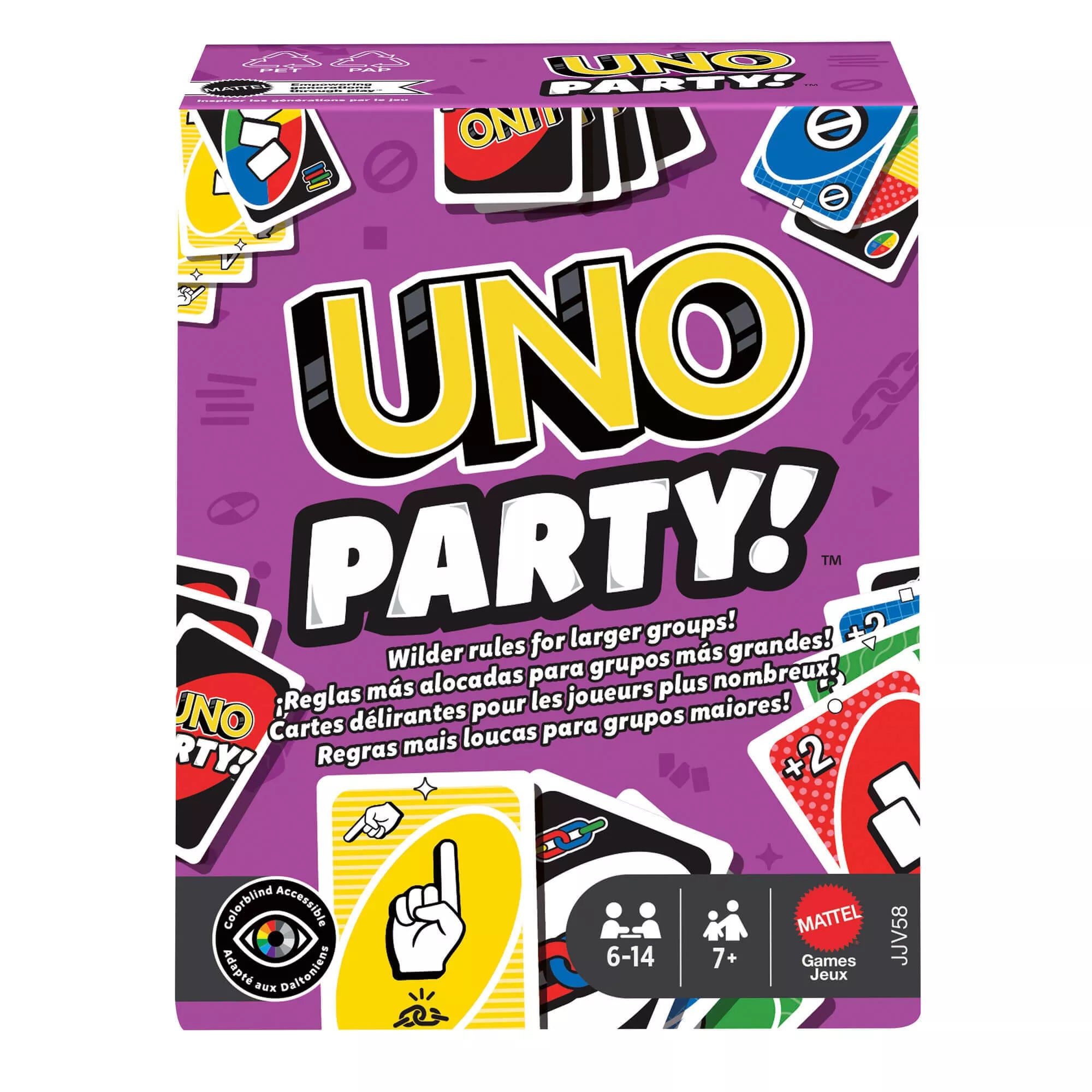 Gather all your friends and embark on an unforgettable UNO Party night. The game is enhanced with special rules to make playing even more fun.· Match colors and numbers like in classic UNO, but be ready for surprises – cards might tell you to point fingers, draw simultaneously, or play in speed mode.· New Wild Cards:– 'Speed' card – play cards out of turn. – 'Draw Together' card – two players draw cards at the same time. – 'Card Pile' card – everyone plays matching colored cards until someone runs out – then they collect all played cards. – 'How Many Fingers – How Many Cards' card – players point fingers at each other; the player must pick up as many cards as there were fingers pointed at them.· Perfect for family nights, parties, and get-togethers.· When you have only one card left in your hand – don't forget to shout "UNO"!· Number of Players: 6-14· Ages 7+