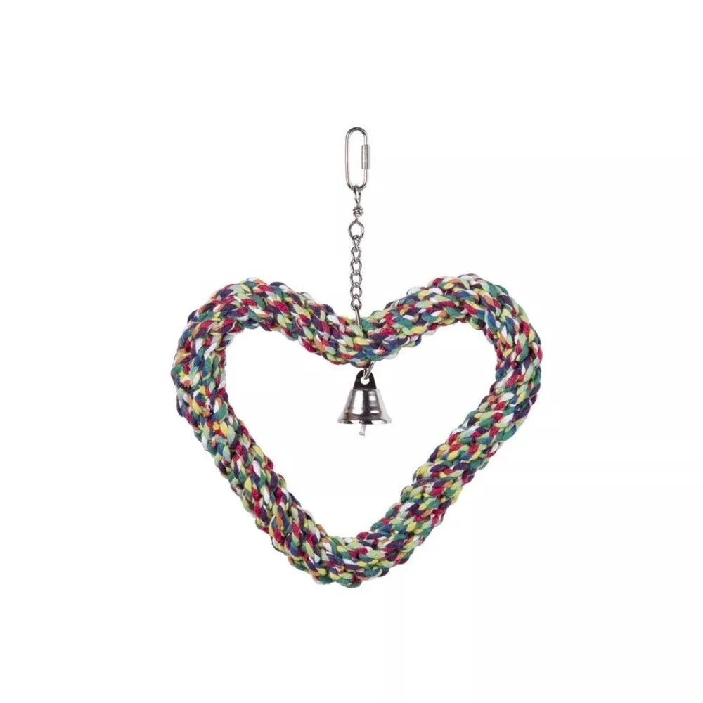 This rope heart toy with a bell will satisfy curiosity, prevent boredom, and guarantee an active pastime for all decorative birds kept in cages. The toy can be easily hung anywhere in the cage using the metal carabiner. Please note: this toy is not suitable for children. Product photos are for illustrative purposes only. The product description is general, and not all features may be mentioned. Information provided on the product packaging is more detailed. We recommend referring to the information on the product packaging.