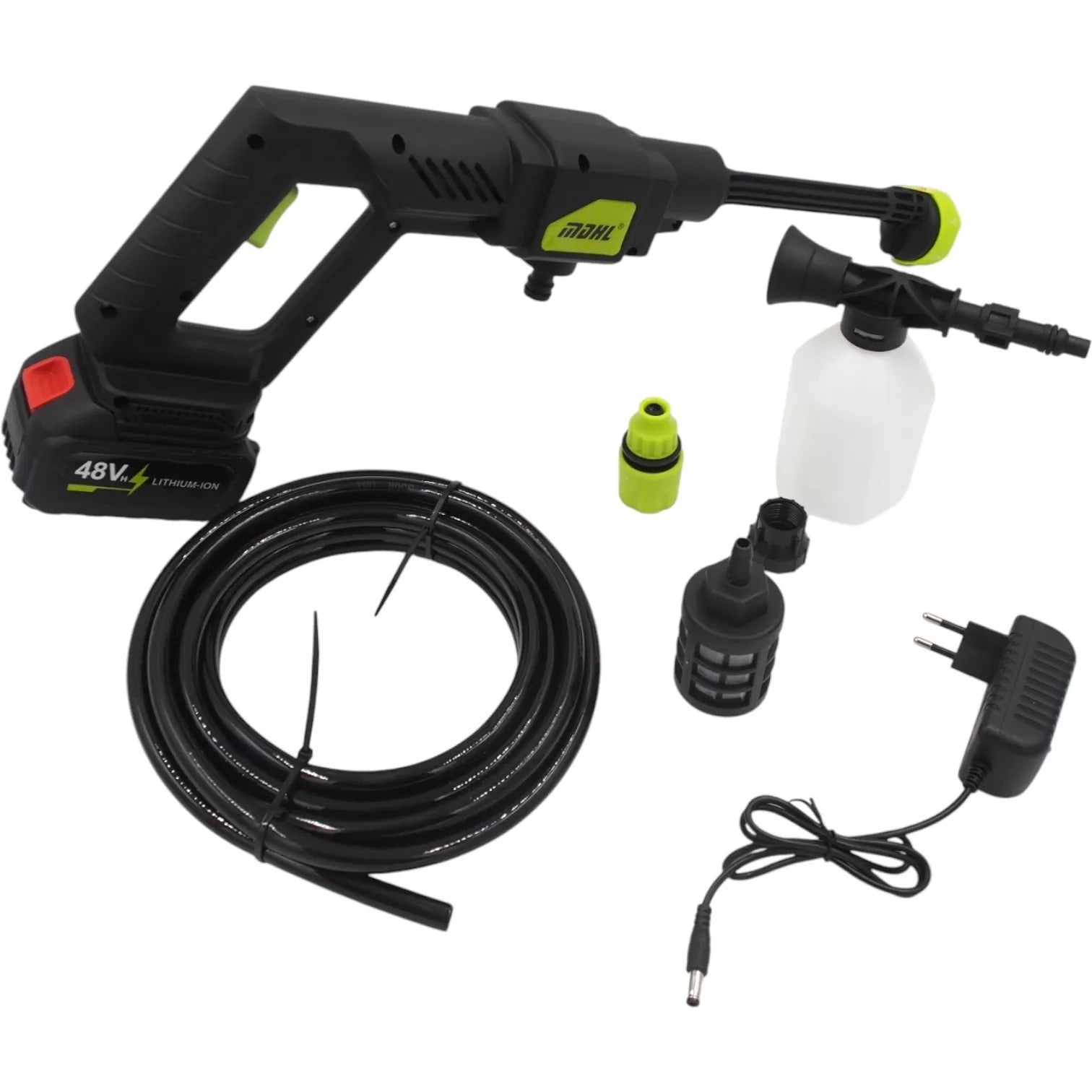 Komplekte purškimo antgaliai, putų talpa, vandens žarna su filtru ir įkroviklis.