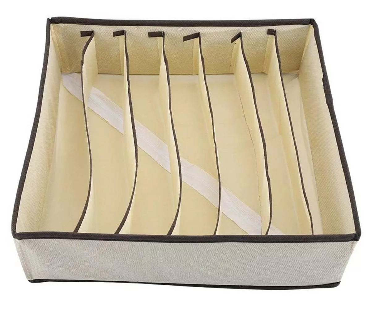 Itin praktiškas apatinių ir liemenėlių dėklas. Puikiai tiks kaip dėklas nuolat išsibarsčiusioms kojinėms ar kaklaraiščiams. Jis gali lengvai tilpti į didesnį stalčių, spintos apačioje arba po mūsų lova. Su 7 vienodais skyreliais, kuriuose galite tilpti liemenėlę be sulankstymo! Pagaminta iš kvėpuojančios medžiagos, kuri užtikrins mūsų apatiniams ilgesnį šviežumą. Organizatorius puikiai tiks ir kaip konteineris smulkiems žaislams ar kitoms reikalingoms smulkmenoms!