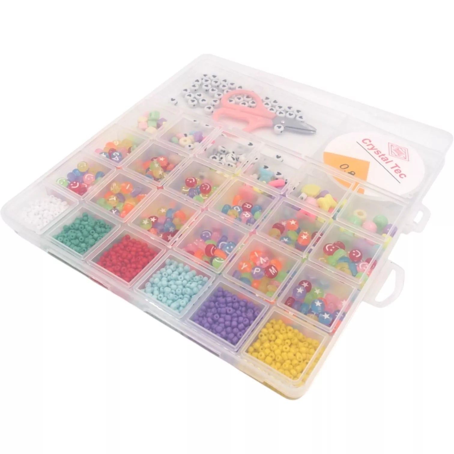 Didelis spalvotų karoliukų rinkinys, skirtas apyrankių, vėrinių ir kitų rankdarbių kūrimui. Įvairių formų bei spalvų karoliukai leidžia derinti skirtingus stilius ir sukurti originalius aksesuarus. Rinkinys papildytas elastine virve ir žirklutėmis, todėl galima iš karto pradėti kurti.