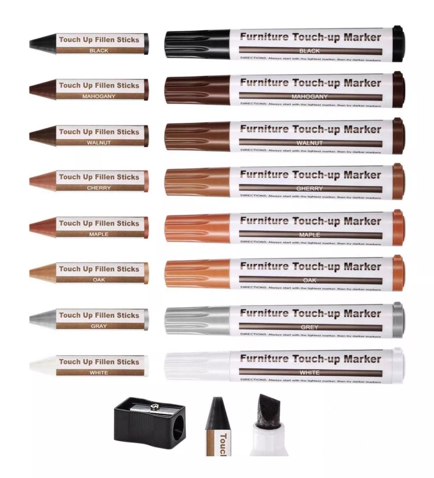 Universalus baldų remonto rinkinys skirtas greitam ir efektyviam įbrėžimų, nuskilimų, įtrūkimų bei nusidėvėjimo žymių paslėpimui ant medinių ir laminuotų paviršių. Rinkinys leidžia lengvai atkurti natūralią baldo spalvą ir išvaizdą be brangių remonto darbų.