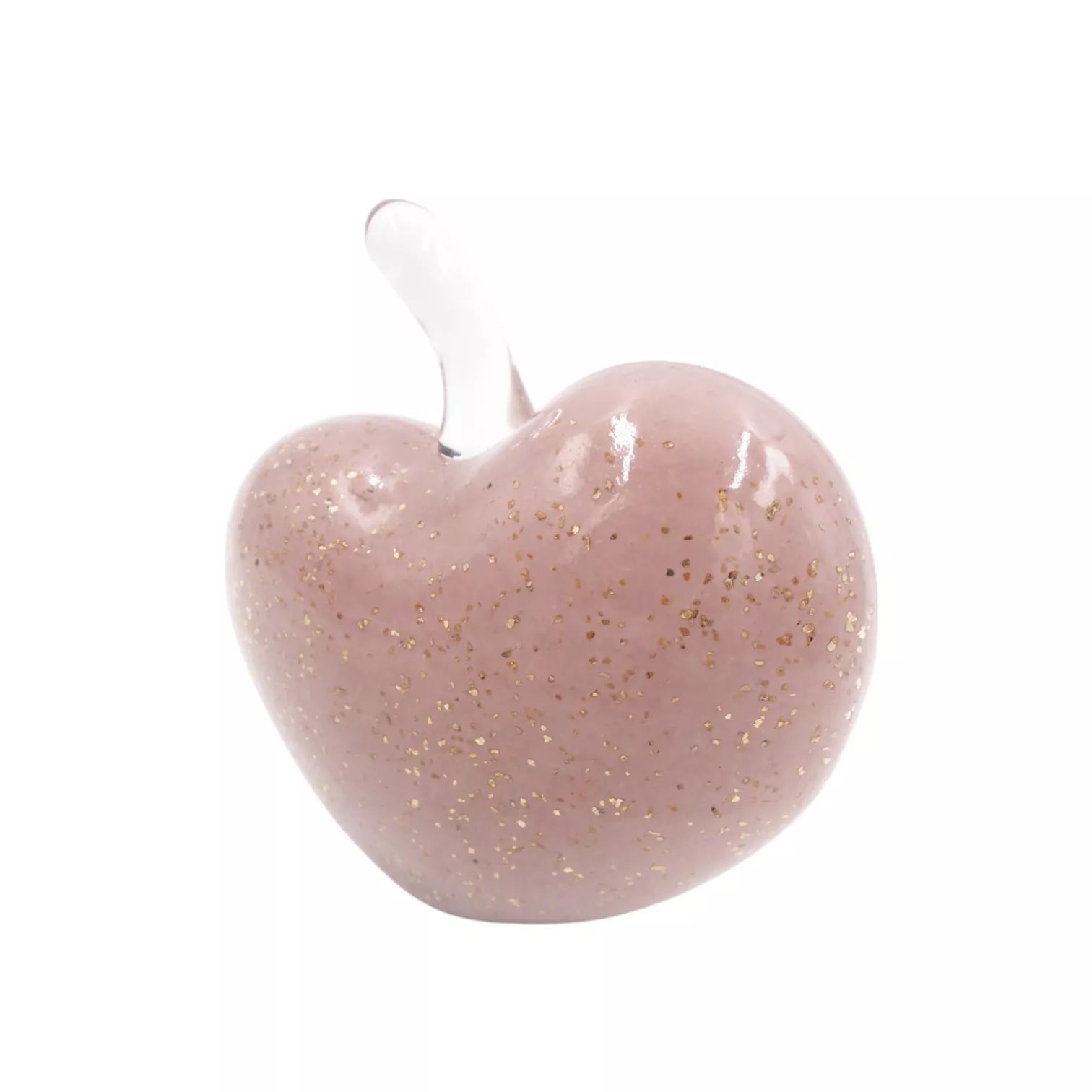 Išskirtinio dizaino stiklinė dekoracija širdies formos – elegantiškas ir jaukus akcentas Jūsų interjerui. Švelnios rausvos spalvos paviršius su subtiliais taškeliais sukuria šilumos ir meilės atmosferą. Permatomas stiklinis kotelis primena obuolio stiebelį ir suteikia dekoracijai žaismingumo bei originalumo.
