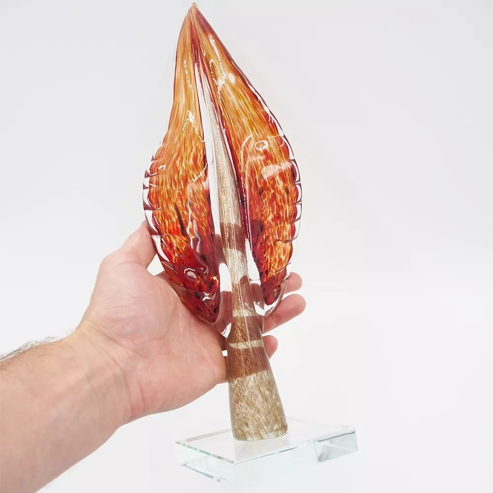 Išskirtinio dizaino dekoratyvinė stiklo skulptūra primena elegantišką liepsnos formą, įkūnijančią dinamiką ir subtilų rafinuotumą. Sodri gintarinė spalva, pereinanti į skaidrų stiklą, sukuria nepakartojamą šviesos žaismą, kuris pagyvins bet kurią interjero erdvę. Idealiai tinka tiek moderniam, tiek klasikiniam stiliui.