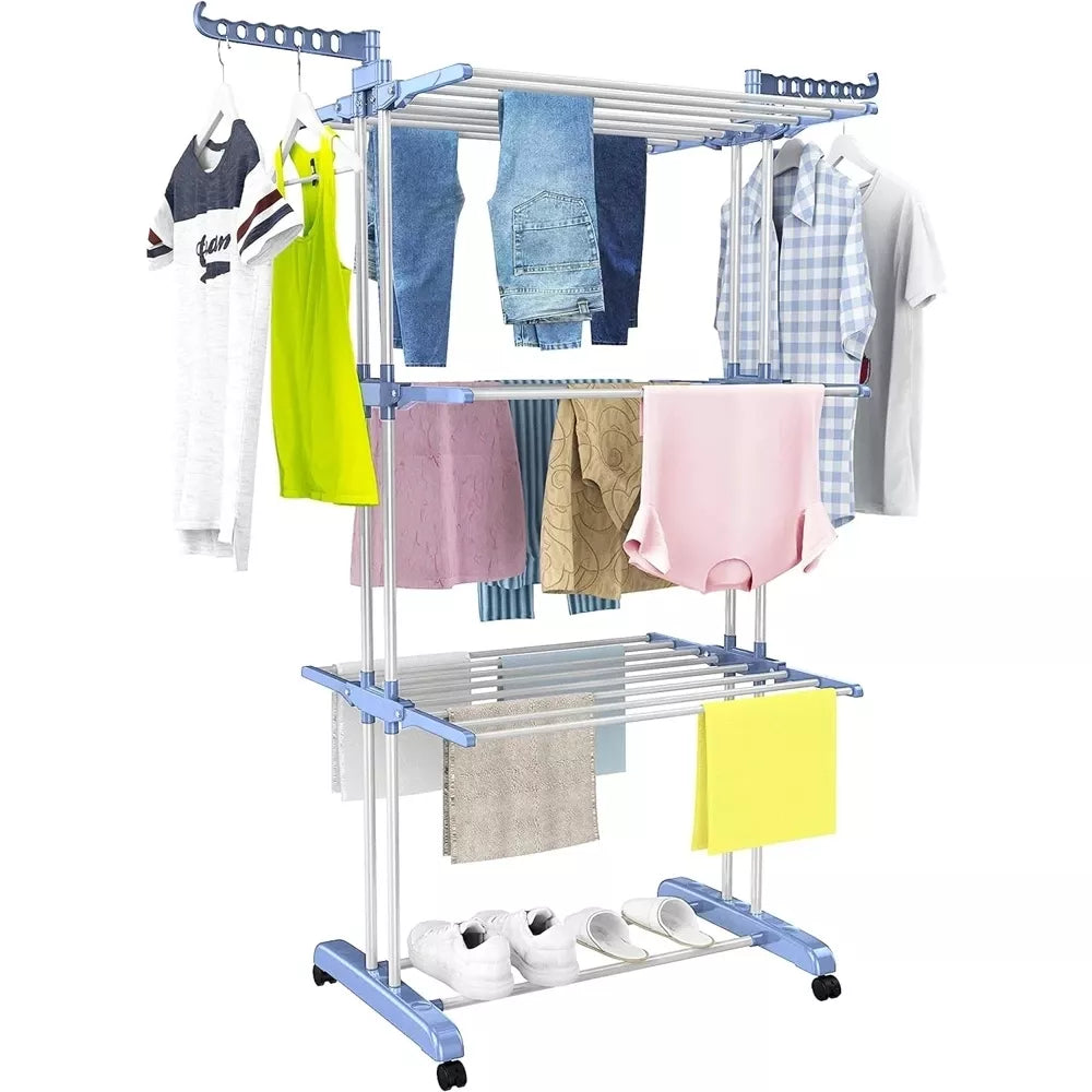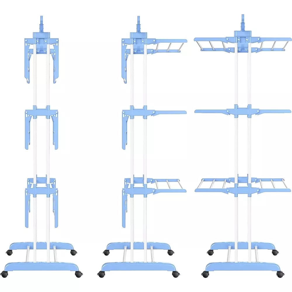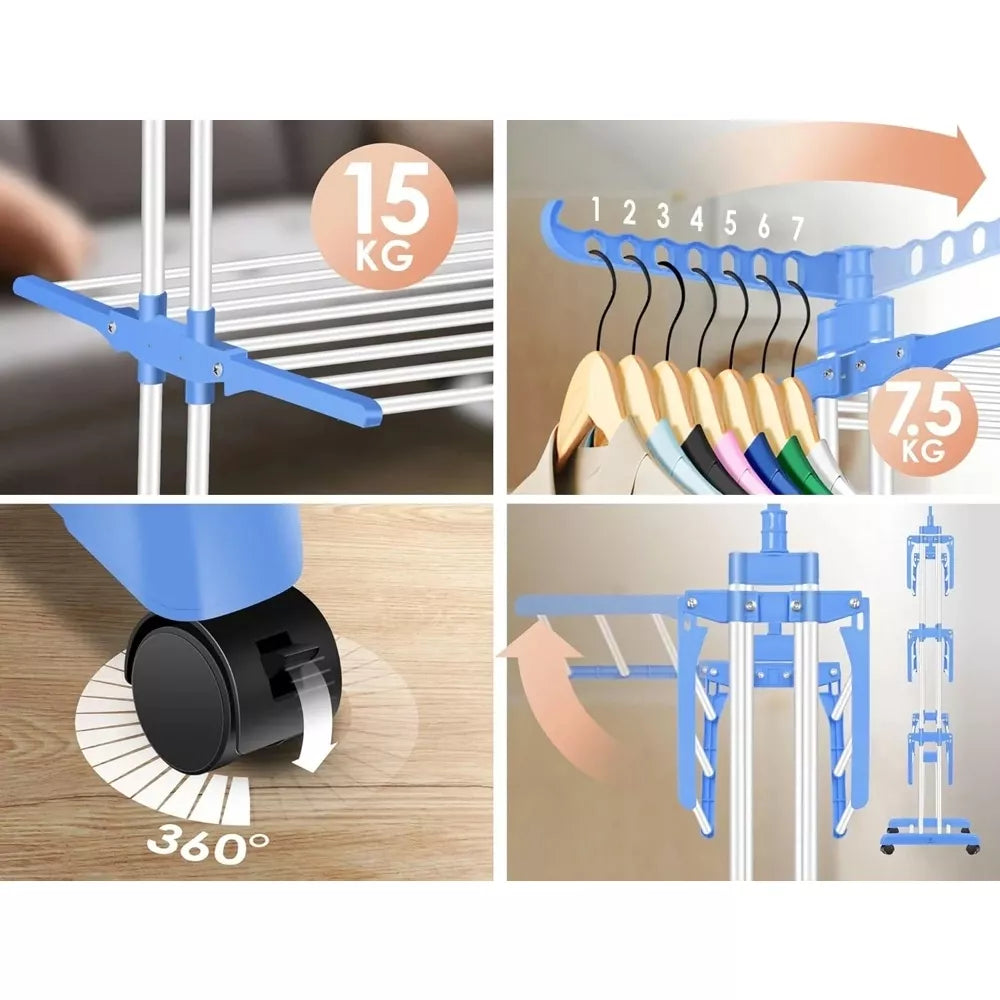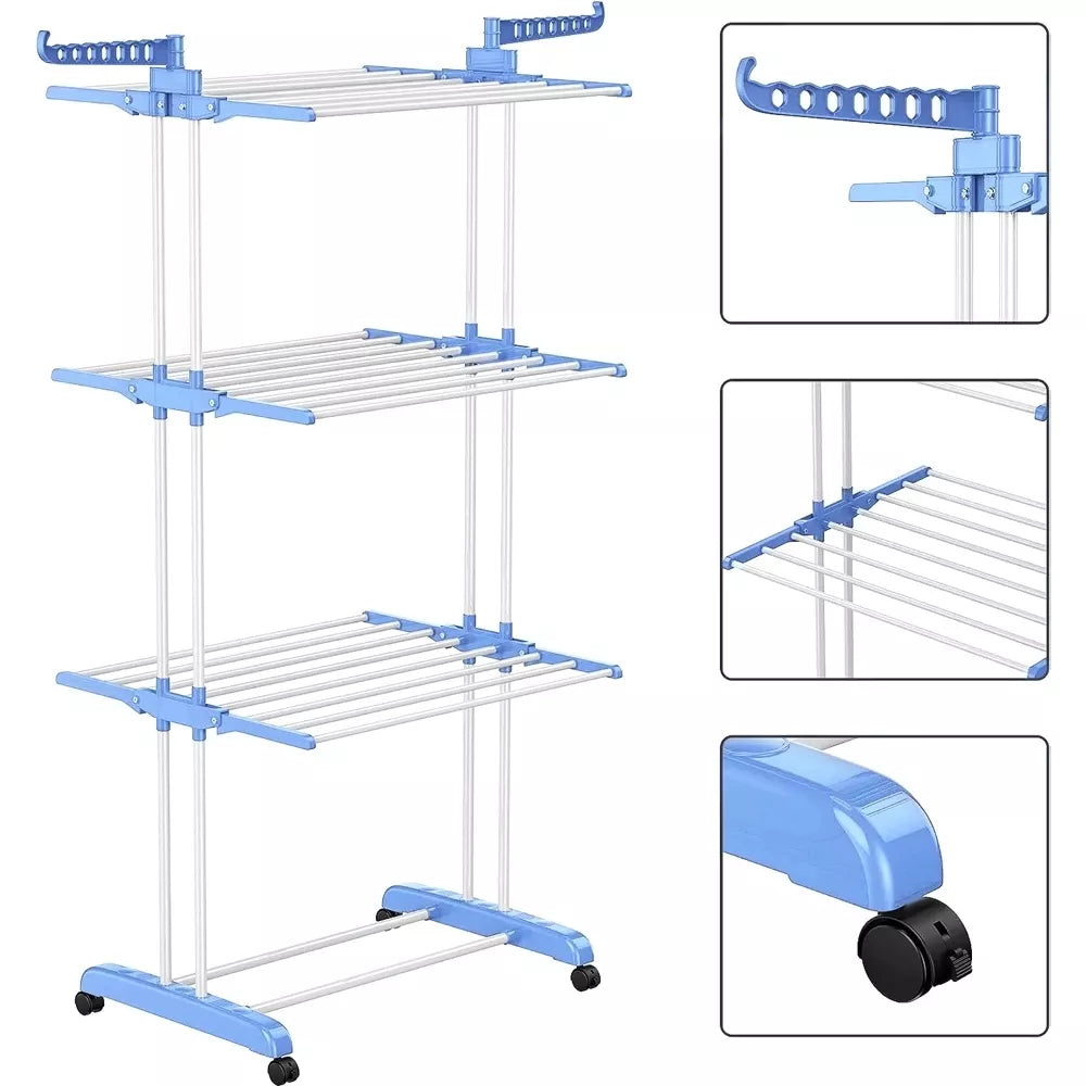 Trijų aukštų drabužių džiovyklė su ratukais ir papildomais laikikliais – talpus ir universalus sprendimas skalbiniams džiovinti.