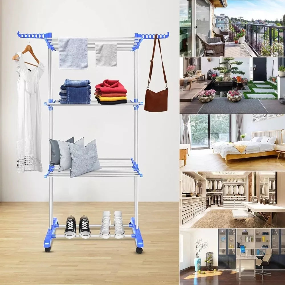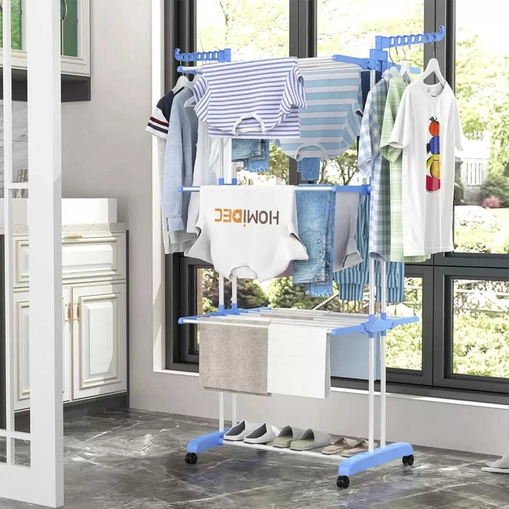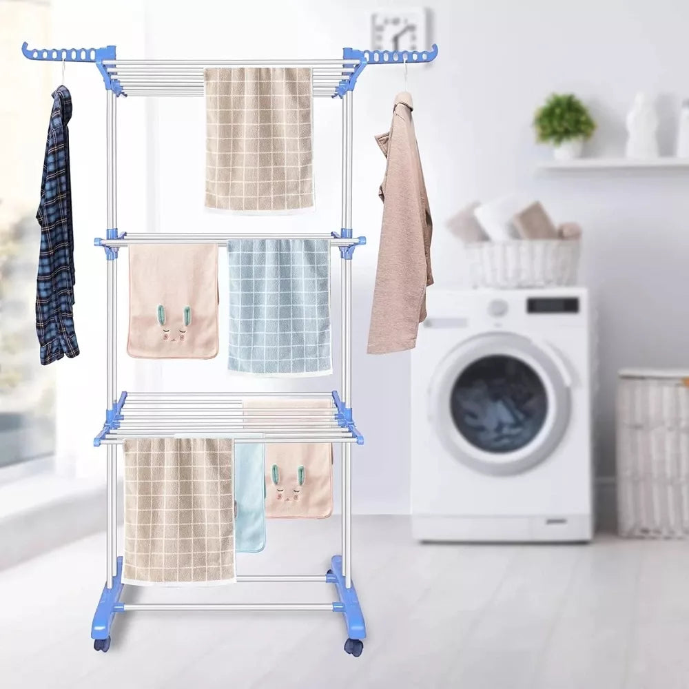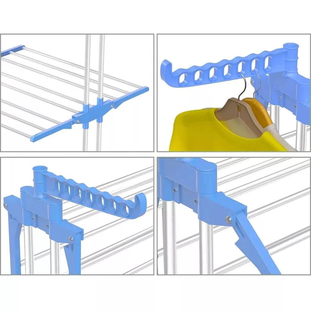 Trijų aukštų drabužių džiovyklė su ratukais ir papildomais laikikliais – talpus ir universalus sprendimas skalbiniams džiovinti.