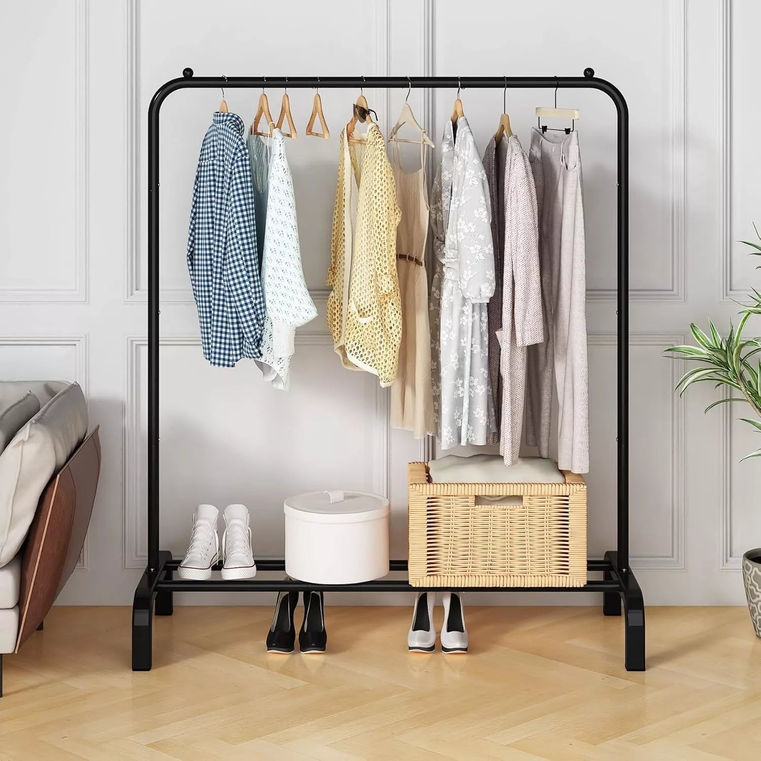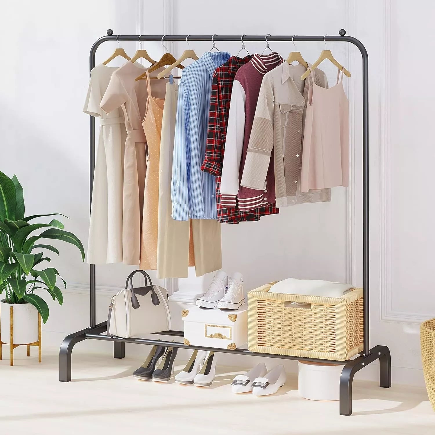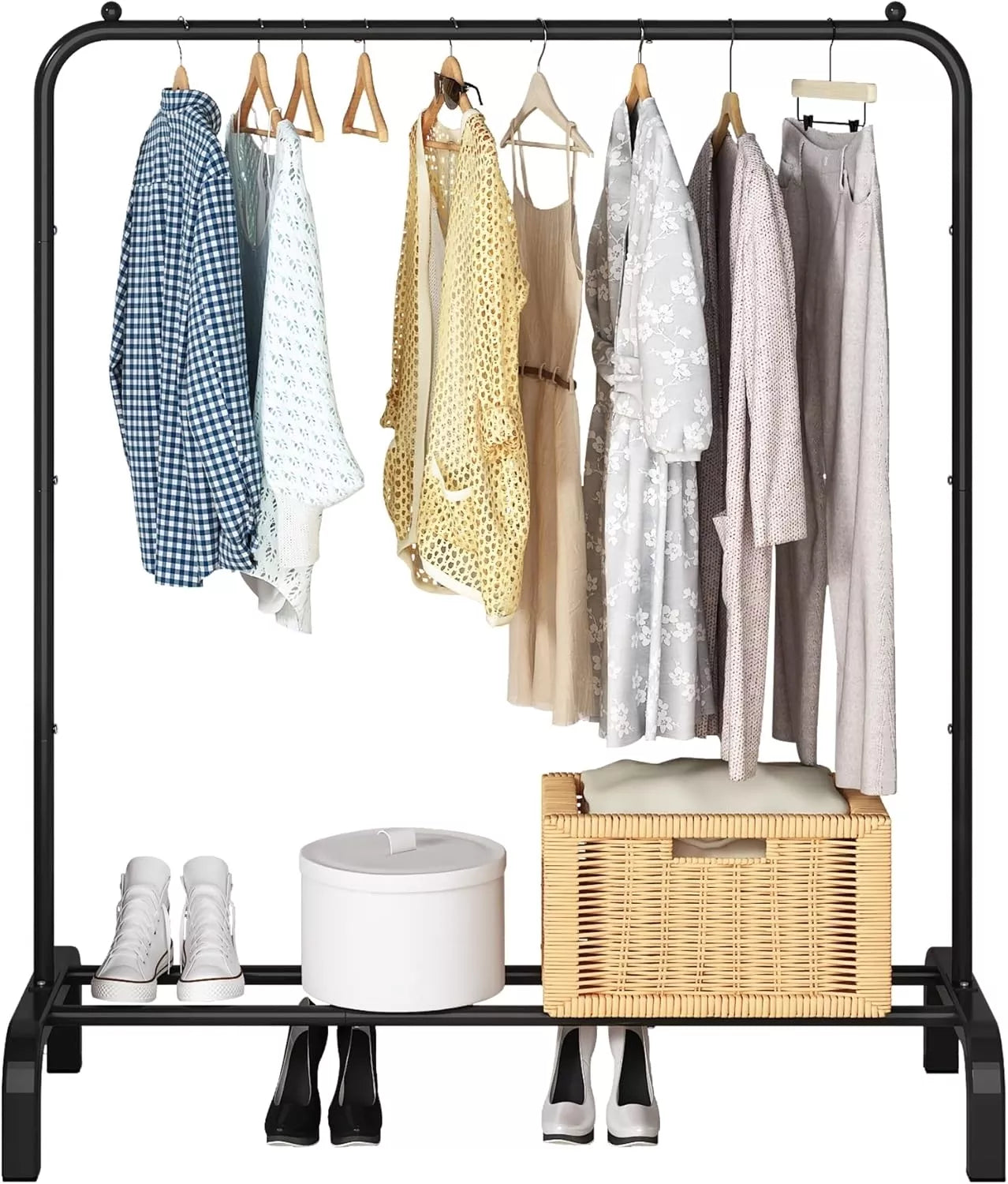 Ieškote praktiško, stilingo ir tvirto sprendimo drabužių laikymui? Ši metalinė drabužių kabykla puikiai tiks tiek miegamajam, tiek prieškambariui, skalbyklai ar net svetainei. Su integruota pakabinimo zona ir didele laikymo lentyna apačioje – tai universalus baldas, padedantis palaikyti tvarką ir sutaupyti vietos.