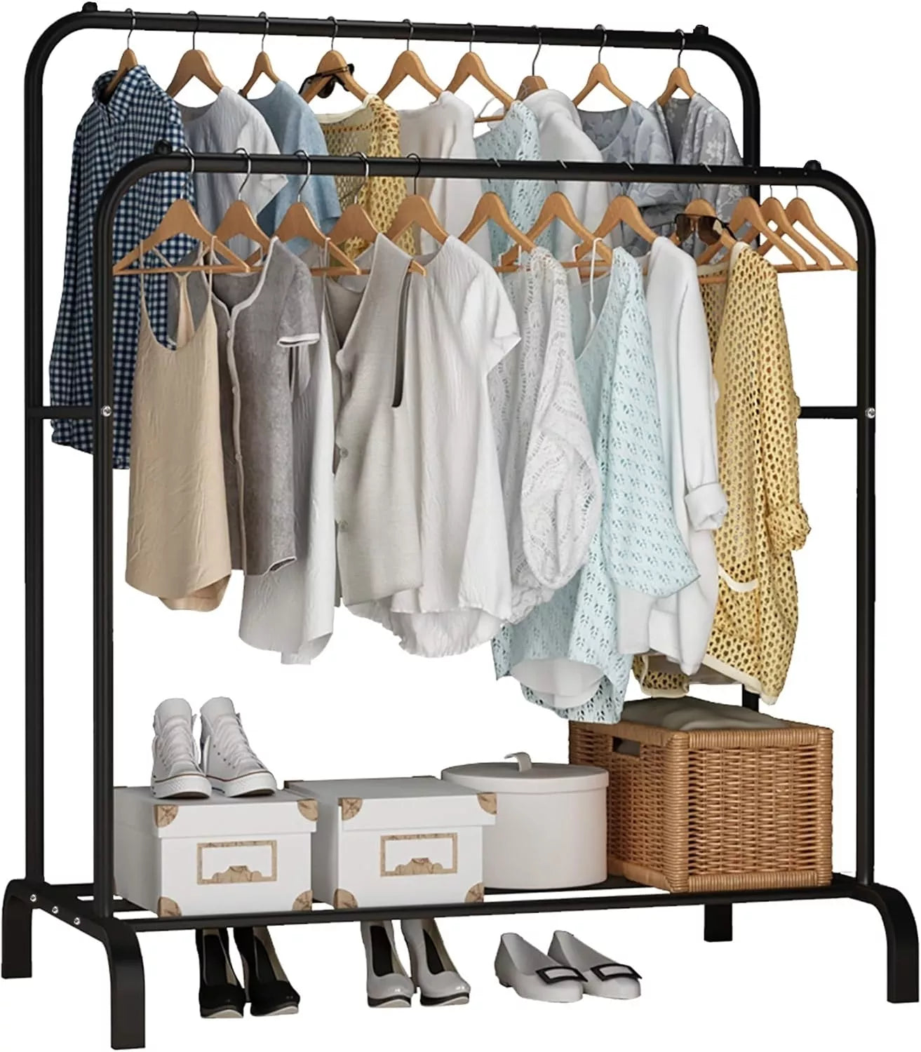 Tvirta metalinė konstrukcija užtikrina stabilumą ir ilgaamžiškumą, o du pakabinimo strypai leidžia patogiai rūšiuoti drabužius pagal ilgį ar sezoniškumą. Apatinė lentyna puikiai tinka batams, dėžutėms ar krepšiams laikyti. Modernus juodos spalvos dizainas dera prie įvairių interjero stilių.