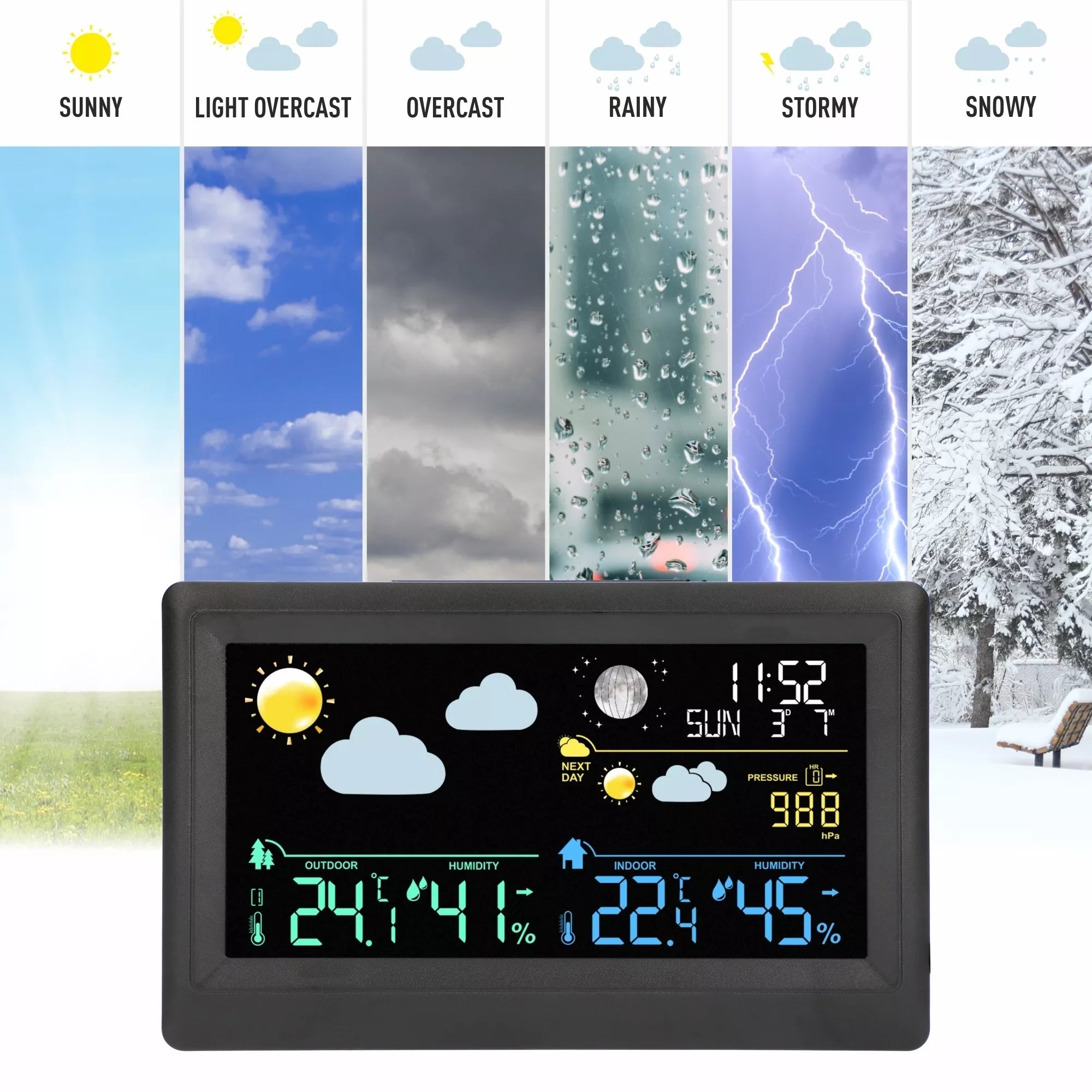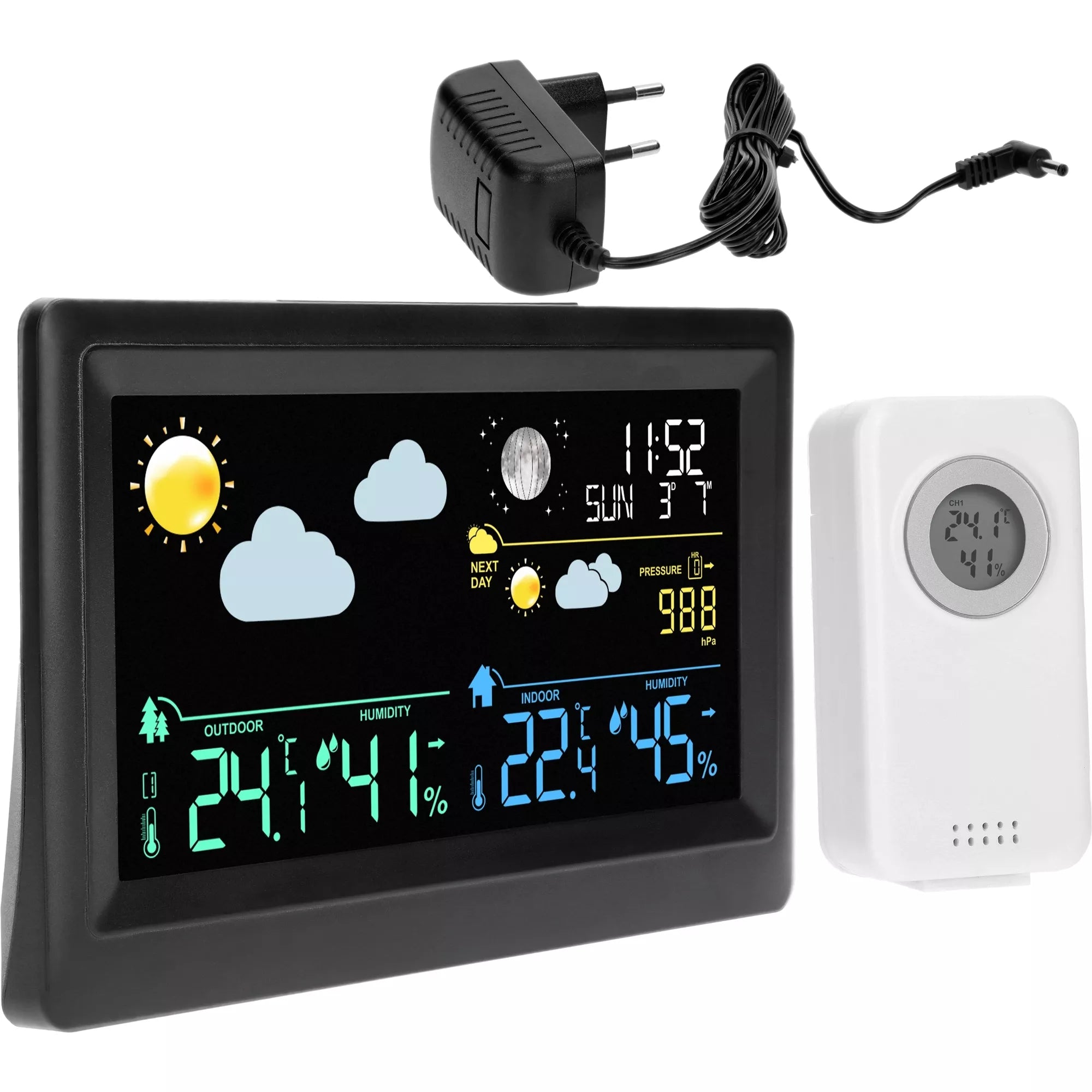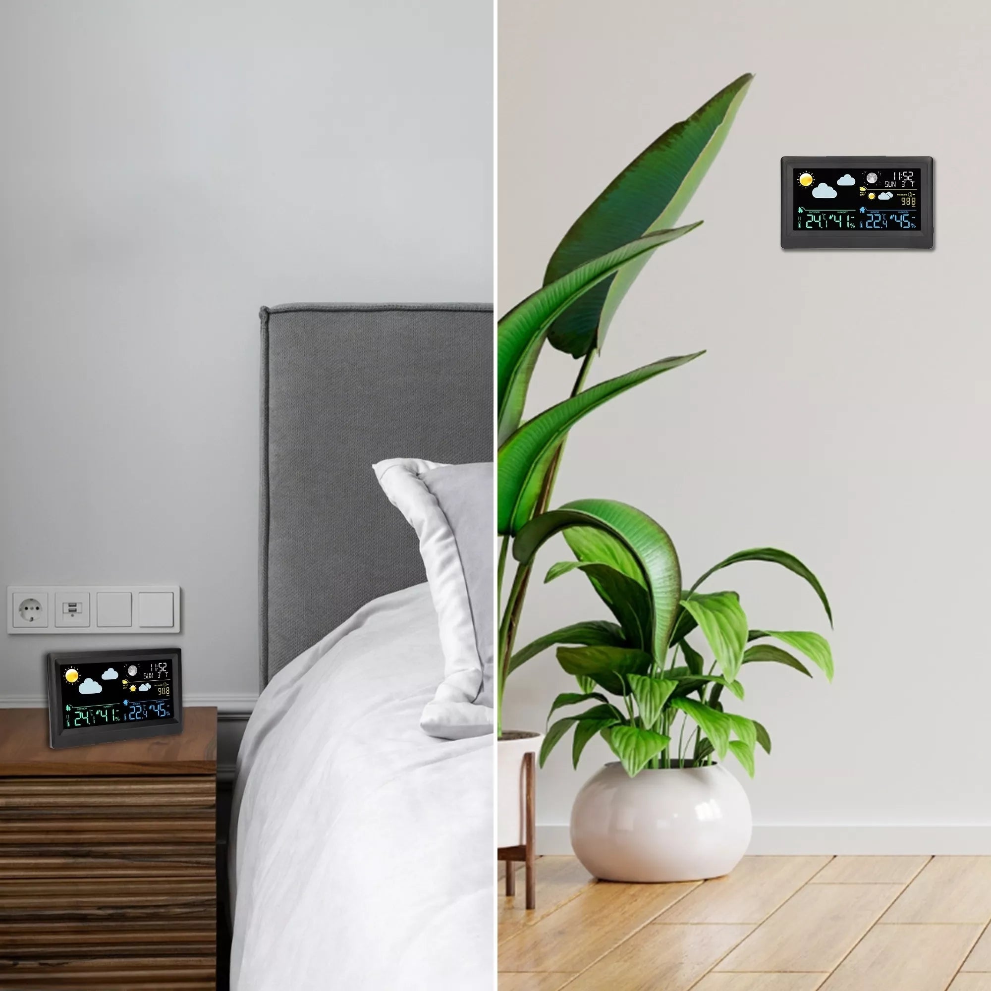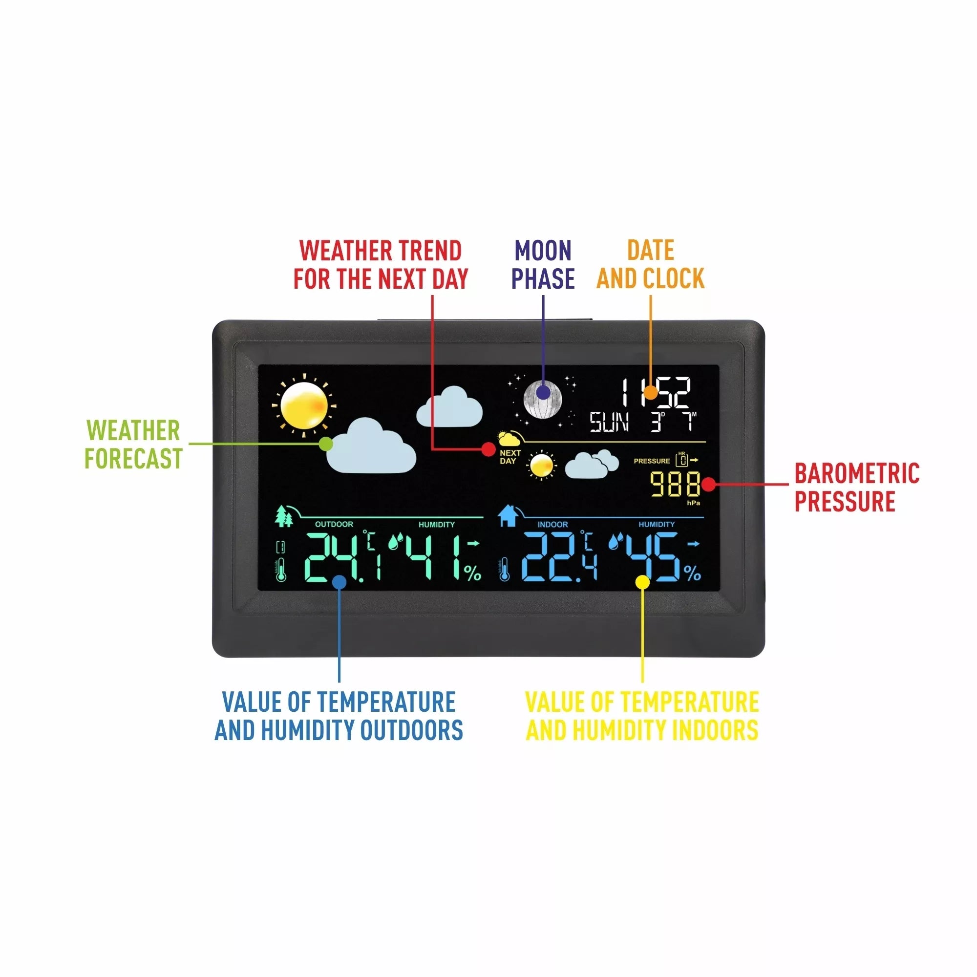 Ši pažangi orų stotis leidžia vienu metu stebėti temperatūrą ir drėgmę tiek namuose, tiek lauke. Prietaisas pateikia kitos dienos orų prognozę ir leidžia suprasti pokyčius, padedant geriau pažinti orų ciklus. Estetiškos orų asistento ir mėnulio fazių grafikos skaitymą daro malonesnį. Taip pat turėsite žadintuvą ir kalendorių.