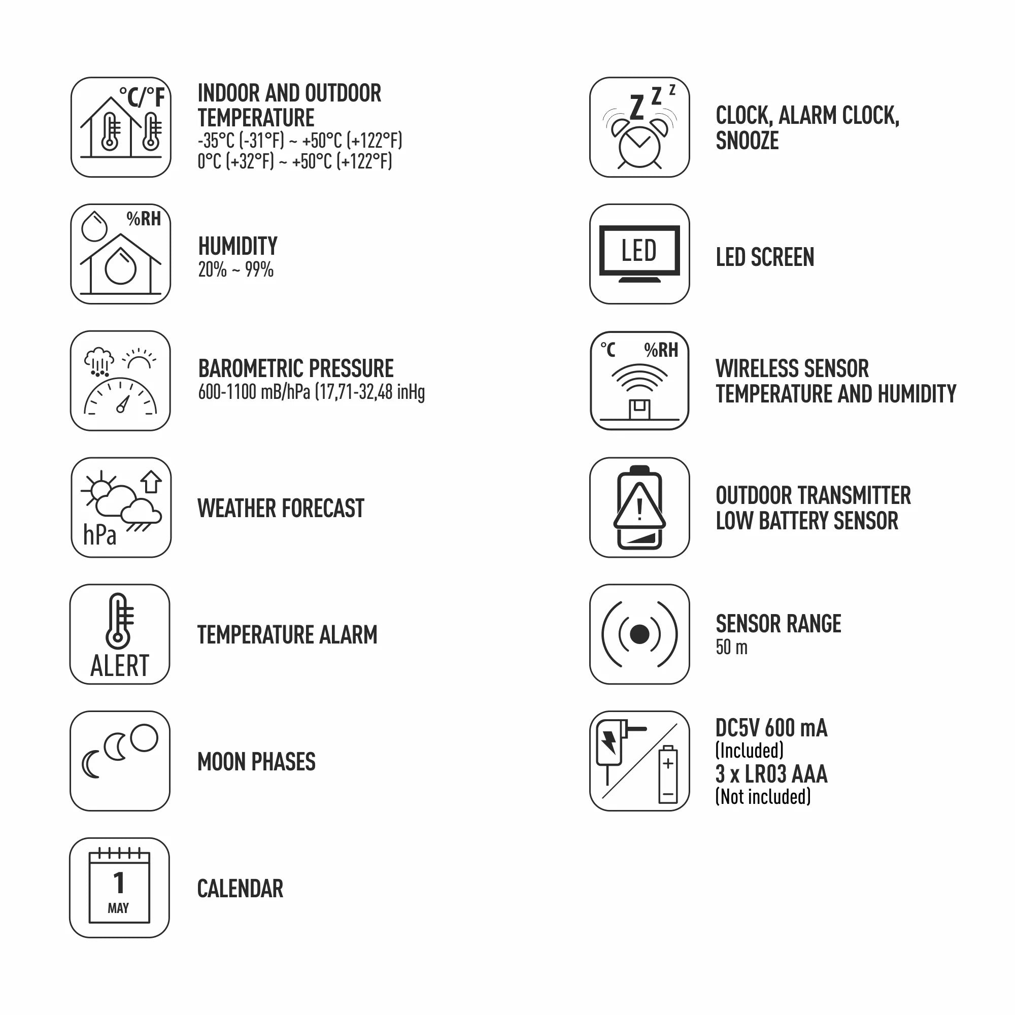 Multifunkcionalumas – laikrodis, žadintuvai, kalendorius, temperatūra, oro slėgis ir drėgmė, orų prognozė bei tendencijos, orų asistentas su mėnulio fazėmis – viskas viename įrenginyje su išskirtiniu tikslumu ir kokybe!