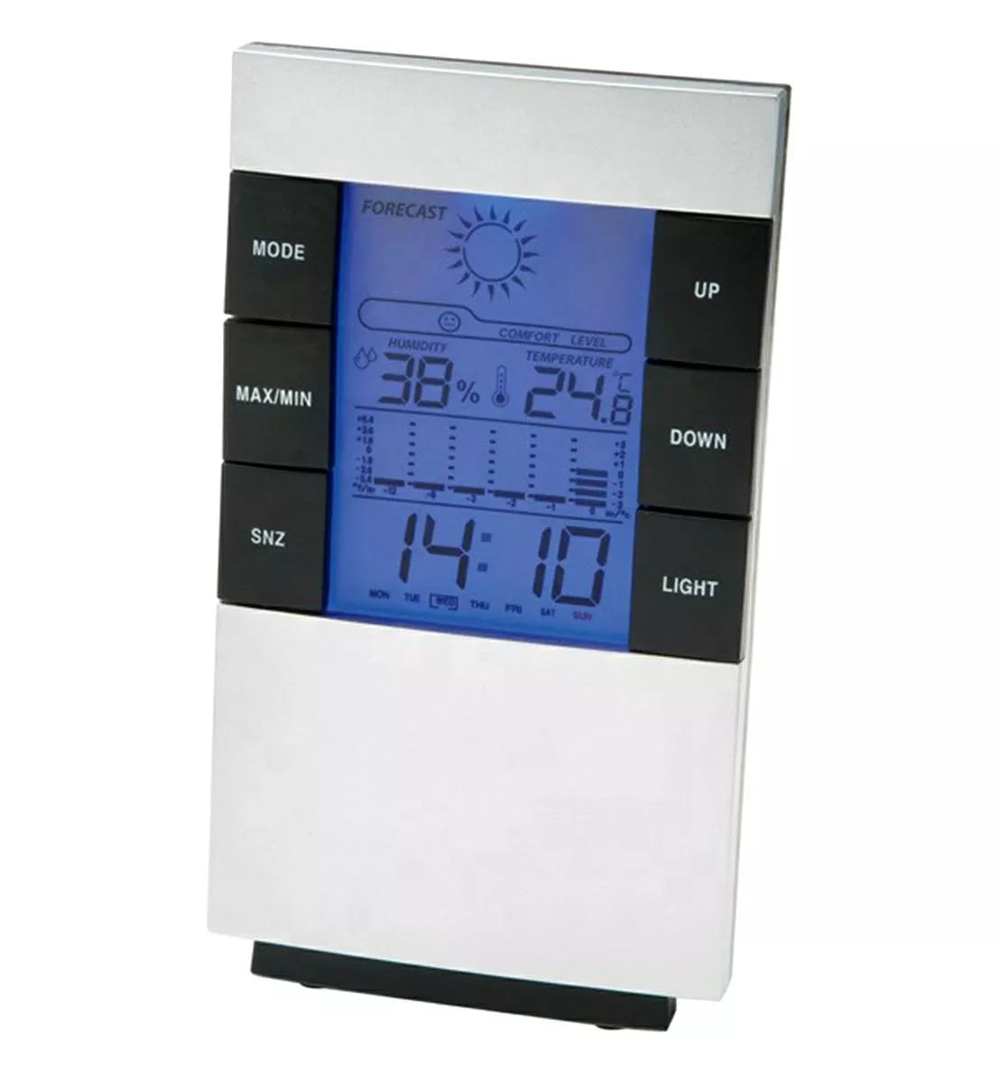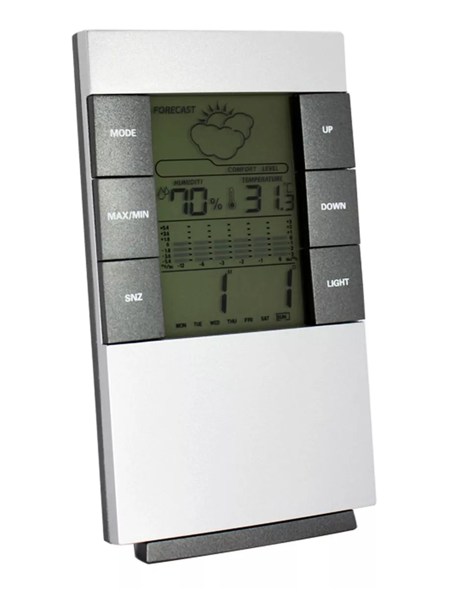 Elektroninis termometras namams. Kompaktiški matmenys ir akumuliatoriaus veikimas užtikrina naudojimo patogumą. Prietaisas rodo esamą temperatūrą ir oro drėgmę patalpoje. Taip pat yra laikrodis su žadintuvu, paprastas kalendorius ir orų prognozė. Didelis ir įskaitomas LCD ekranas su apšvietimu leidžia lengvai patikrinti matavimus.