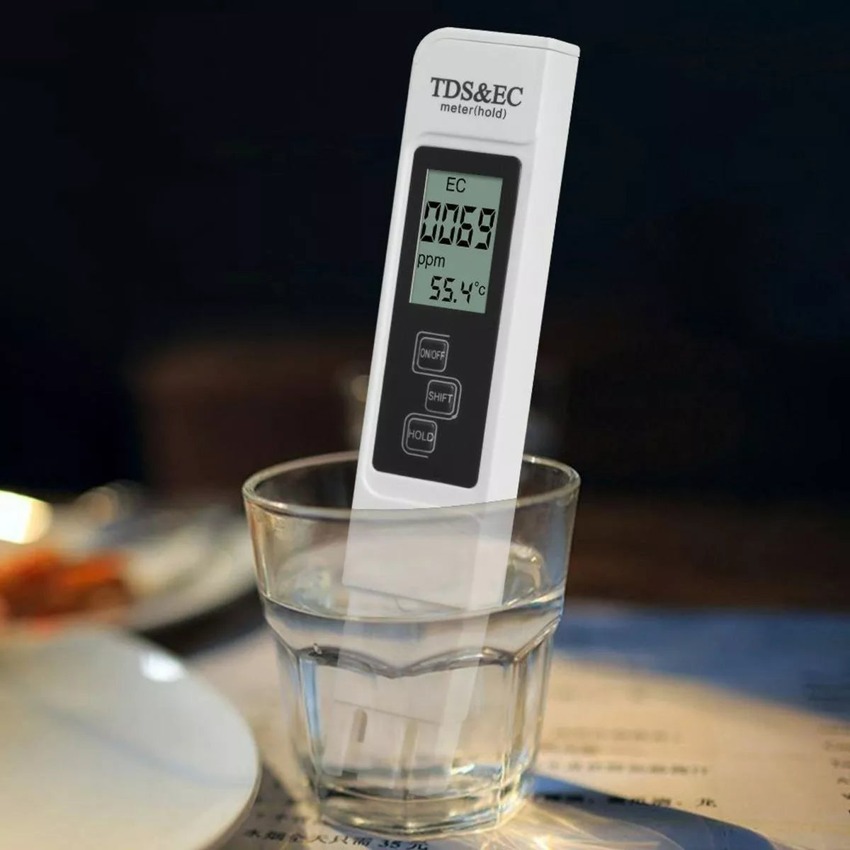 Vandens kietumo matuoklis leidžia patikrinti vandens užterštumo neorganinėmis medžiagomis lygį. Matuoklis kalibruojamas "ppm" reikšmėmis - milijoninėmis dalimis, o tai yra populiariausias metodas pasaulyje, leidžiantis nustatyti vandenyje ištirpusių cheminių molekulių kiekį. Kuo mažiau užterštas vanduo, tuo mažesnis bus jo elektrinis laidumas. Žalias, nefiltruotas vanduo gali būti net 200 PPM arba didesnis.EB vandens laidumas gali būti laikomas druskos kiekio rodikliu, vandenys, kuriuose yra mažai jonų, turi mažą elektrinį laidumą, o, pavyzdžiui, jūros vandens laidumas yra labai didelis. Dažniausiai naudojamas vandens laidumo vienetas yra μS/cm (= mikro-Siemens/cm). Gėlo vandens arba tvenkinio vandens laidumas turi būti nuo 300 iki 1200 μS/cm.Testeris pasižymi dideliu matavimo tikslumu.Matavimo rezultatas nuskaitomas skaidriame LCD ekrane. Galite iš karto patikrinti, ar vanduo yra saugus gerti ir naudoti kitiems tikslams.Naudoti testerį yra neįtikėtinai paprasta – tereikia panardinti elektrodą į vandenį ir matavimo rezultatas iškart pasirodo skaitytuve.Įtaisyti fizinių funkcijų mygtukai palengvina įrenginio naudojimą. Funkcija HOLD išsaugo išmatuotą rezultatą, o SHIFT pakeičia TDS/EC matavimo funkcijąSpecifikacija:
