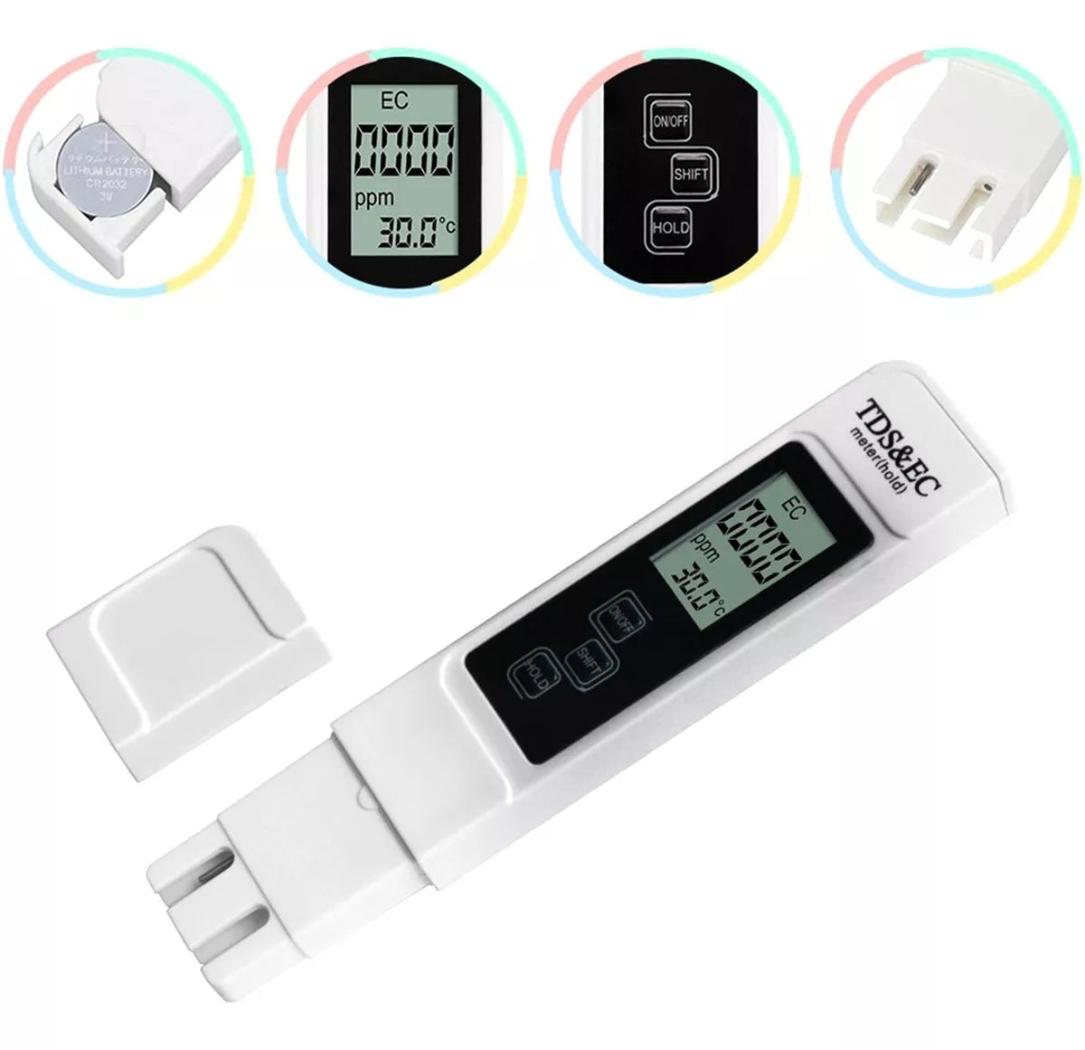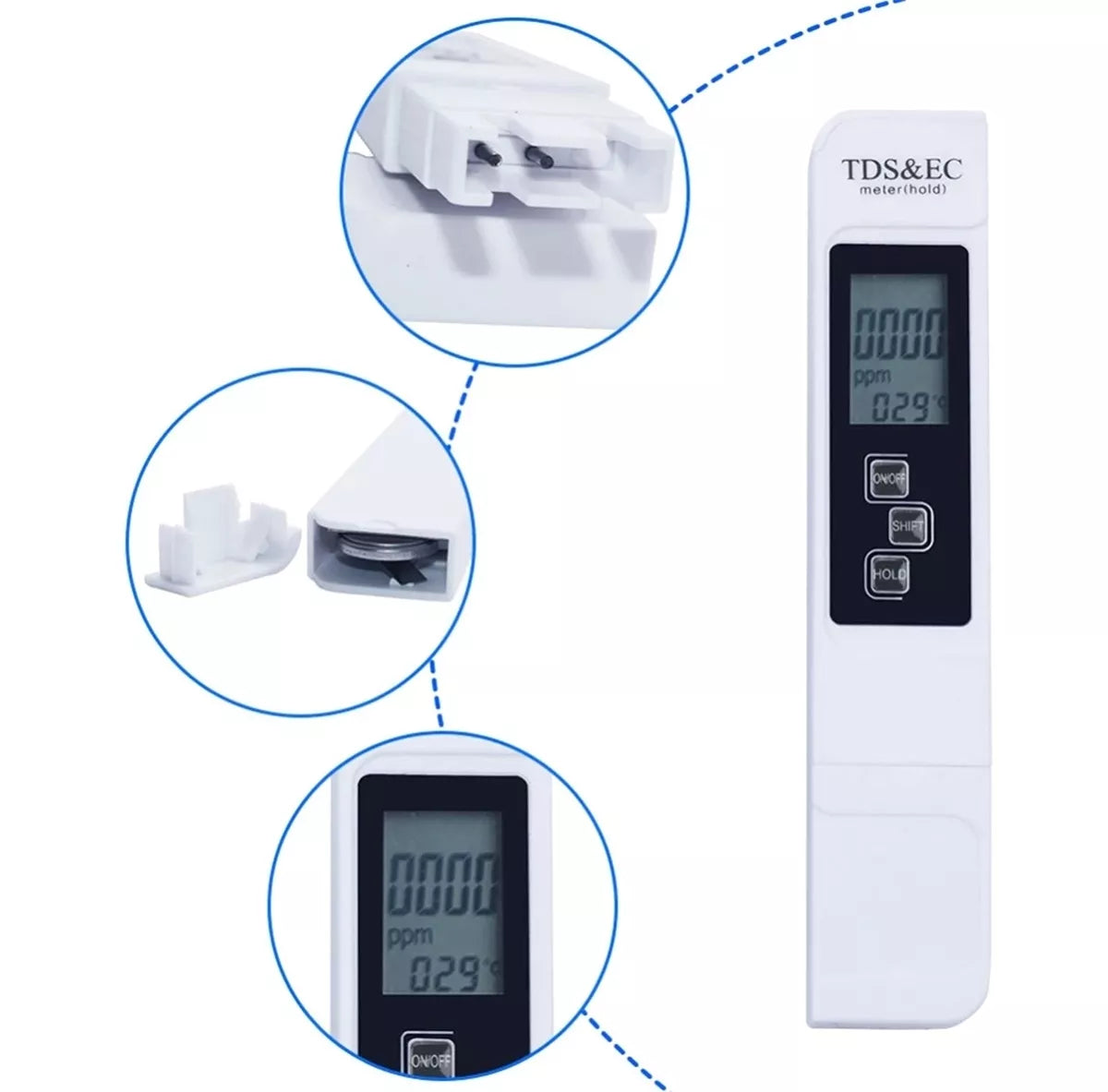 Medžiaga: PP plastikasMaitinimas: 1x 3V CR2032 baterija (pridedama)Turi HOLD atminties funkcijąMatuoja vandens temperatūrą 0,1 - 80 CFunkcijos: TDS (bendras ištirpusių kietųjų medžiagų kiekis – vandenyje ištirpusių teršalų kiekis) / EC (vandens laidumas)TDS rodmuo yra nuo 0 iki 9999 ppmEB rodmuo 0–9999 μS/cm (= mikro-Siemens/cm)LCD ekranasPridedamas praktinis dėklasMatmenys: 154 mm x 30 mm x 14 mmSpalva: balta