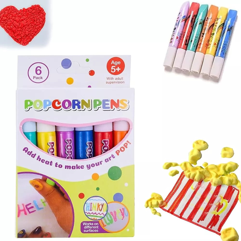 Atraskite kūrybos džiaugsmą su „Popcorn Pens“ pieštukais! Tai ypatingi, šiluma aktyvuojami flomasteriai, kurie leidžia vaikų piešiniams tiesiog iškilti! Paprasta naudoti – nupiešk, pašildyk (pvz., plaukų džiovintuvu), ir stebėk, kaip piešinys tampa erdviniu.