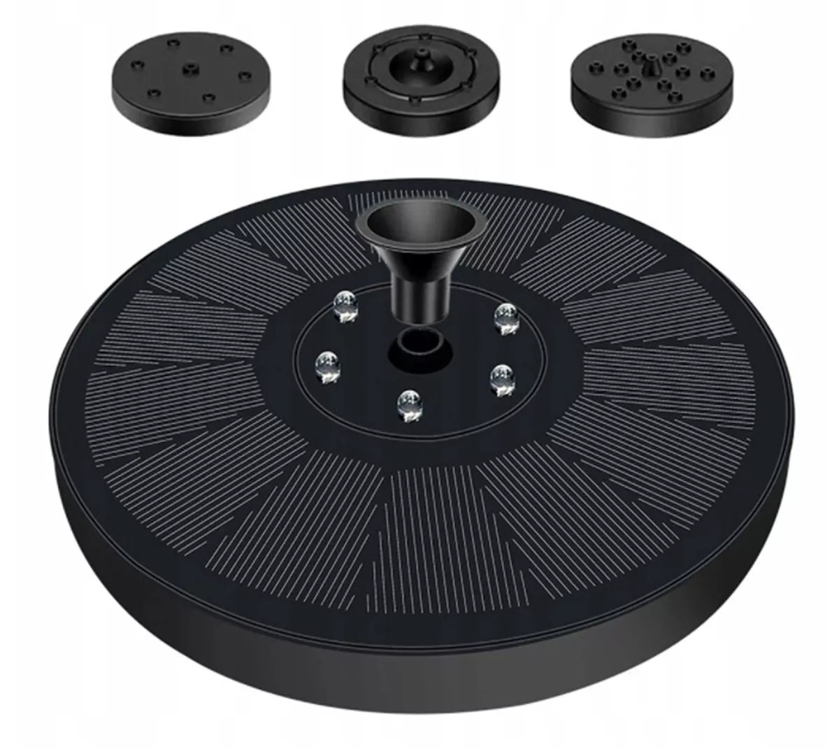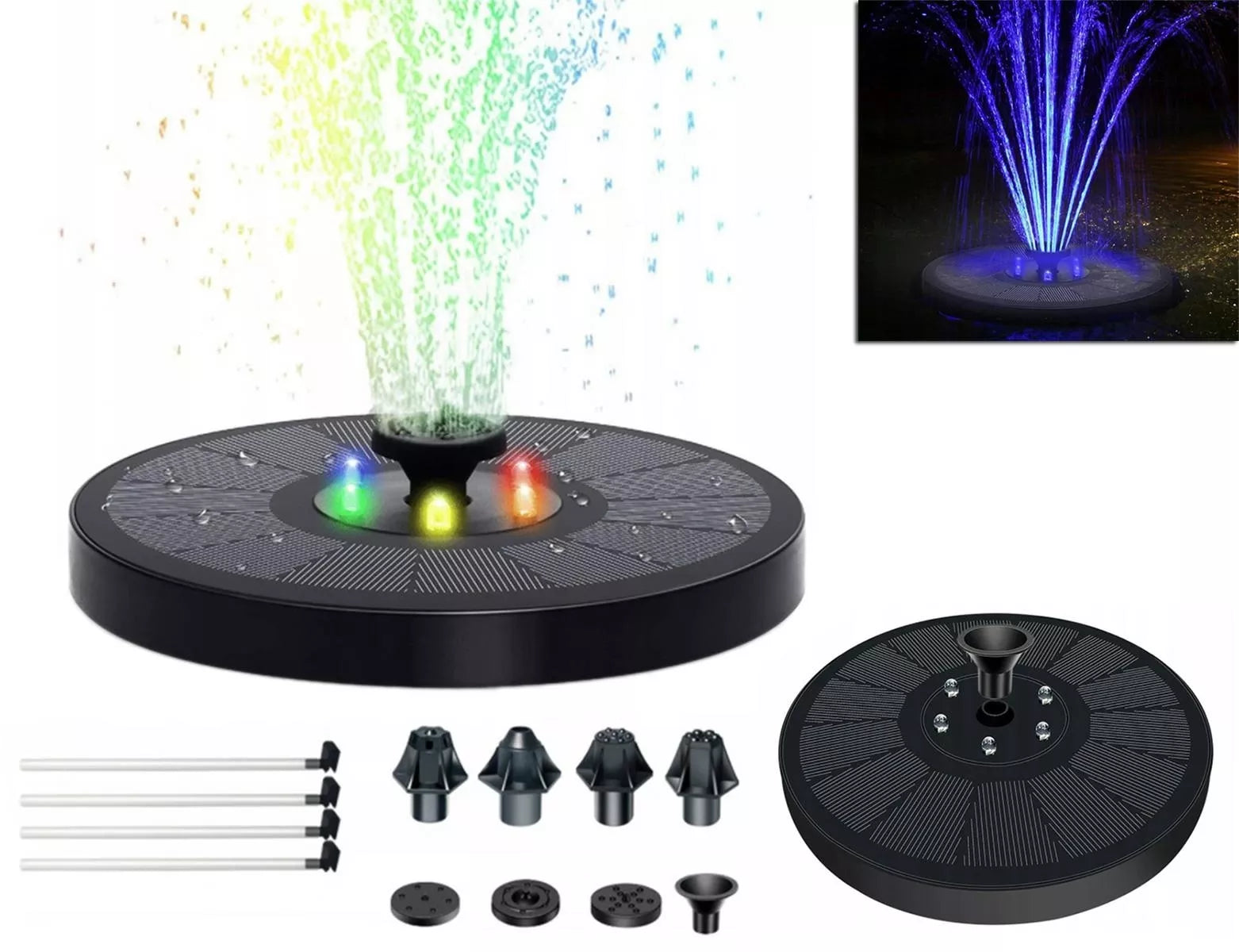Tvenkinio fontanas su saulės baterija.Saulės skydelis su RGB LED apšvietimuKeičiamų antgalių rinkinys (7)
