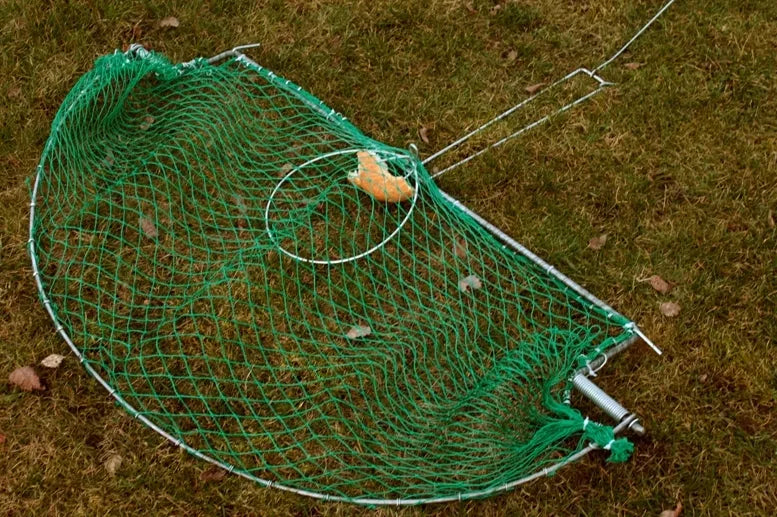 Gaudyklė paukščiams ir triušiamsDidelė gyvų paukščių gaudyklė, skirta balandžiams, putpelėms, fazanams, triušiams ir plėšriesiems paukščiams gaudyti. Šie spąstai yra geriausias būdas atsikratyti mūsų ūkius puolančių kenkėjų.Gaudyklė pagaminta iš cinkuoto plieno. Rėmas pagamintas iš 10 mm cinkuotos vielos ir 6 mm skersmens vielos, ant kurios užtemptas 25 mm polietileno tinklas. Visa tai sujungta stipria spyruokle, kuri valdo spąstus.Gyvą gaudyklę reikia pritvirtinti prie žemės naudojant 4 inkarus, tada gaudyklę su tinklu reikia ištempti ir užblokuoti kabliuku, kuris pritvirtinamas prie mažo žiedo ausies. Po žiedu išbarstome grūdus arba pritvirtiname prie jo masalą. Plėšrūnas, norėdamas prieiti prie masalo, pajudins žiedą, kuris atlaisvins spyną. Tinklas nukris ant paukščio, neleisdamas jam ištrūkti.Gaudyklė turi specialias šakutes, ant kurių galite pritvirtinti masalus, pvz., duoną, mėsą ar vaisius.Tai labai padidina gaiduko mechanizmo pajudėjimo tikimybę, nes masalas montuojamas tiesiai ant gaiduko mechanizmo. Bandydamas paimti skanėstą, paukštis tikrai suaktyvins skląstį.