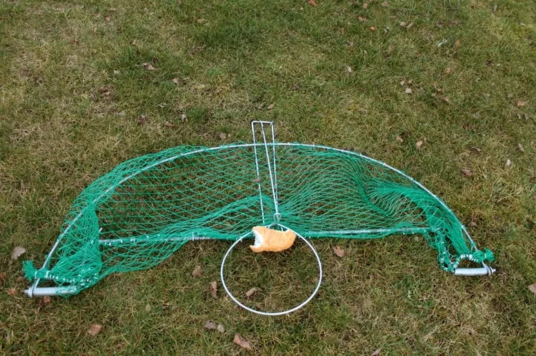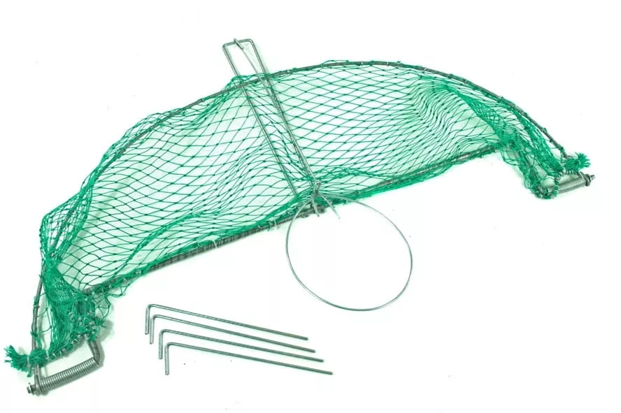 Medžiaga: cinkuotas plienas, žalias arba juodas polietileno tinklelis.Dydis: 50x100cm (ilgis x plotis), viela 6mm ir 10mm, tinklelis 25x25mm,Papildomai pridedami 4 inkarai gaudyklei tvirtinti.