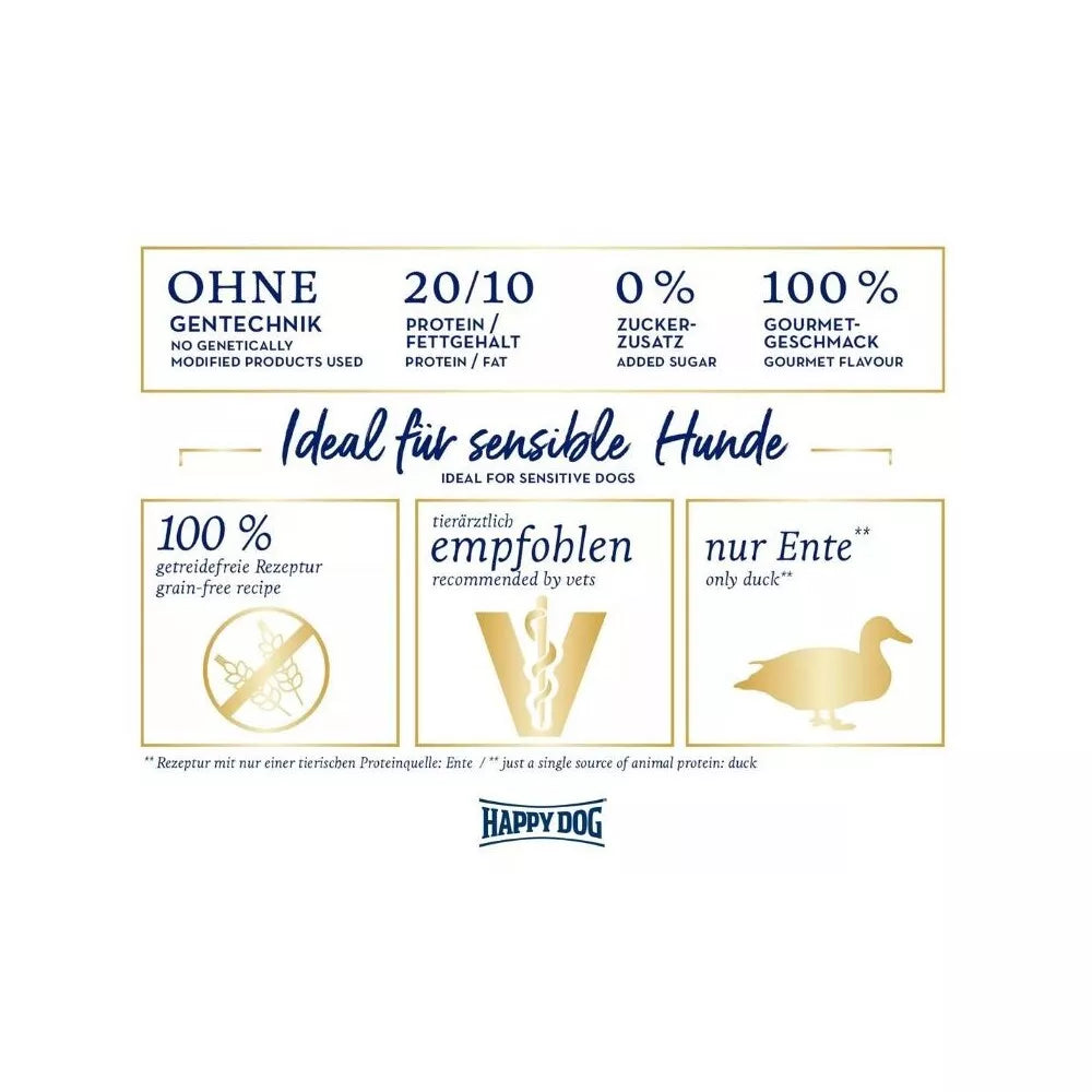 Happy Dog France maistas vidutinių ir didelių veislių šunims su gardžia antiena ir bulvėmis. Receptas subalansuotas taip, kad Jūsų augintinį aprūpintų visomis būtinomis maisto medžiagomis, vitaminais ir mineralais. Sudėtis papildyta nepakeičiamomis omega 3 ir omega 6 riebalų rūgštimis, kurios palaiko gražų ir žvilgantį kailį, gerą imuninę sistemą.