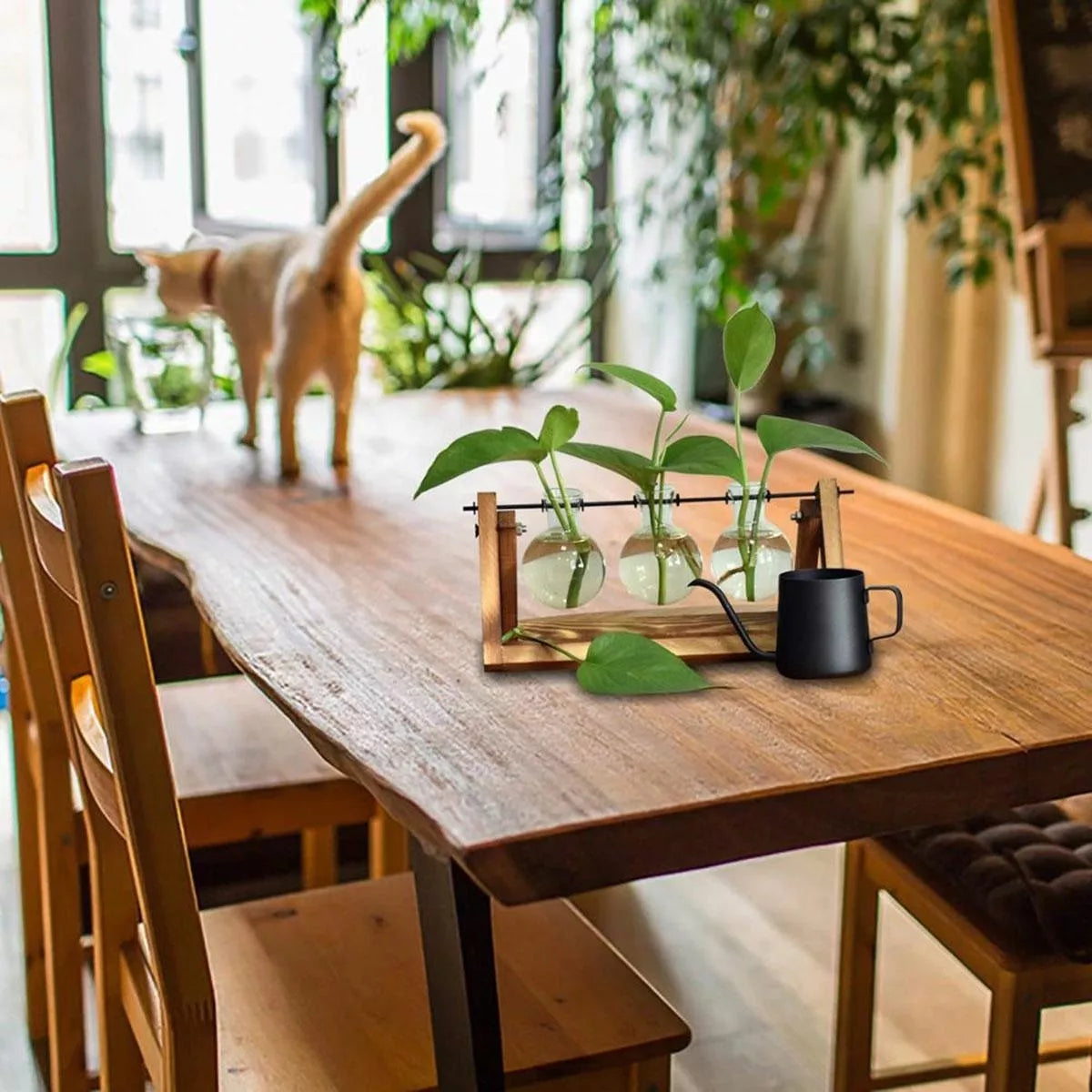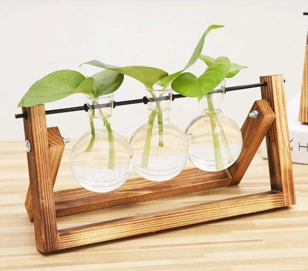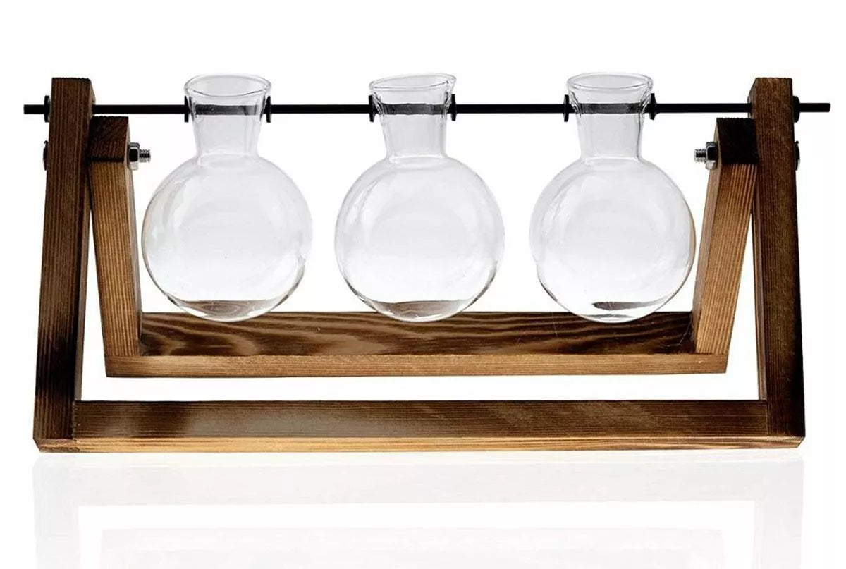 Hidroponinė vaza su trimis stikliniais puodais. Puikiai tinka auginti gėles ir žoleles namuose. Hidroponinė technika yra kultivavimas be dirvožemio, naudojant vandens ir mineralinės druskos tirpalus, kurie leidžia augalams augti nenaudojant dirvožemio. Jame yra estetinis medinis stovas. Jis puikiai tiks kaip vidaus apdaila, parodanti visą augalų šaknų sistemą.