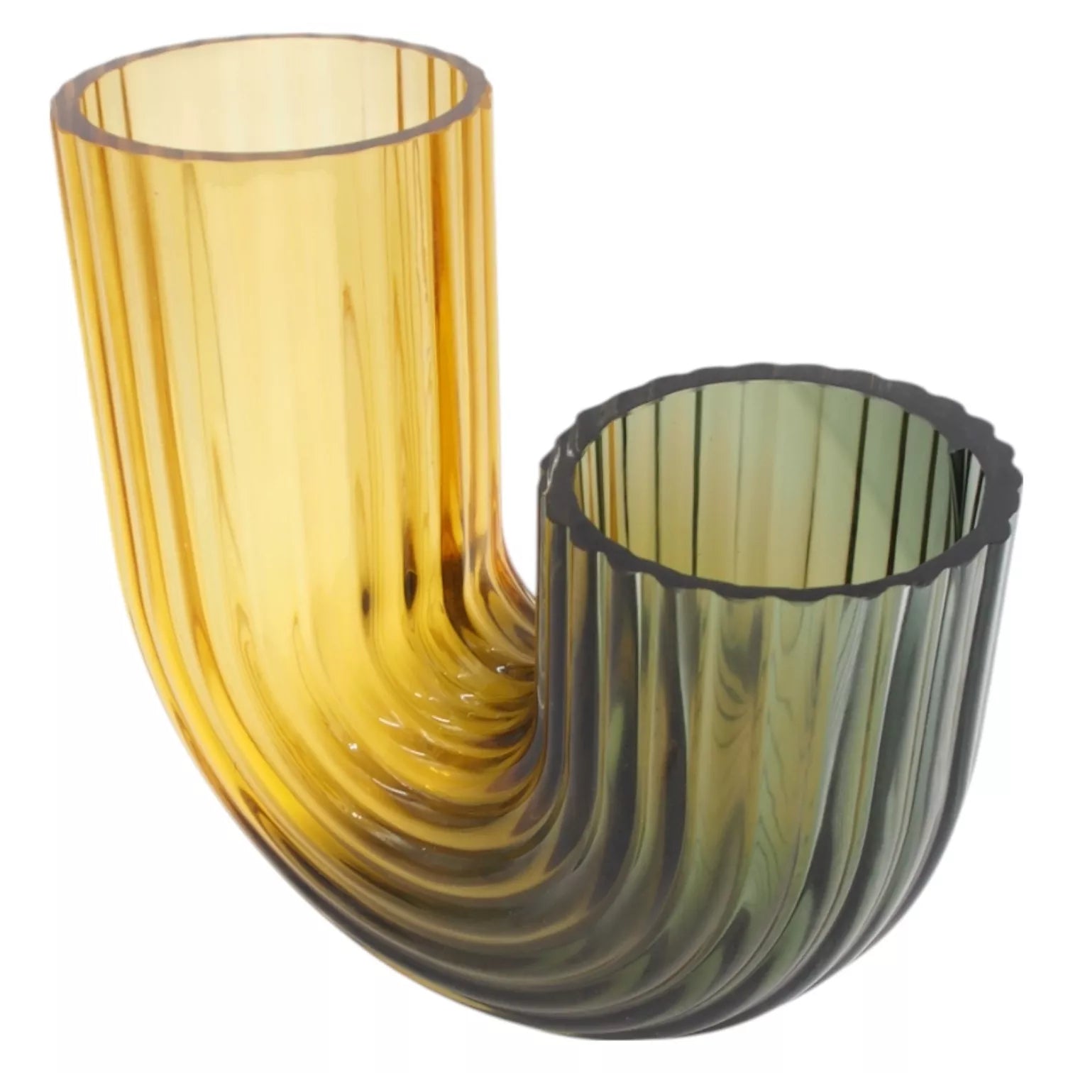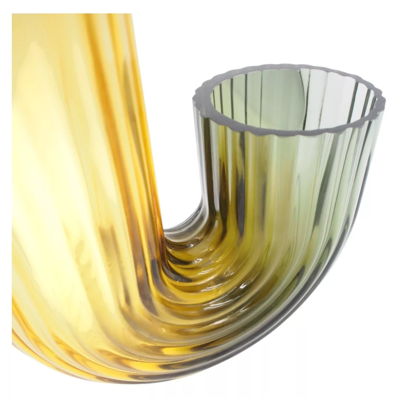 Moderni ir elegantiška stiklinė vaza, pasižyminti unikaliu lenktu dizainu bei subtiliu spalvų perėjimu. Gelsvai žalsvas atspalvis sukuria šiltą ir jaukią atmosferą bet kuriame interjere. Tinka tiek gėlėms, tiek kaip dekoratyvinis elementas be papildymų.