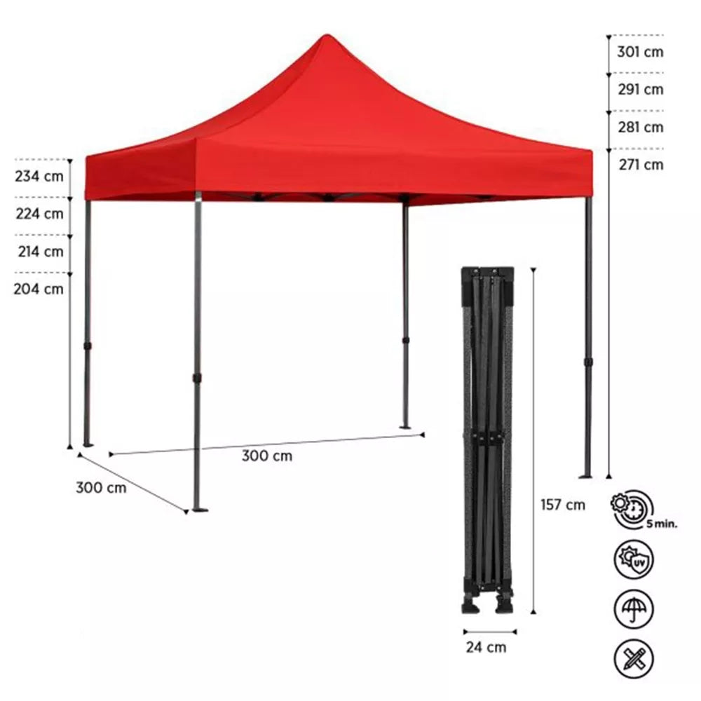 Šis erdvus ir praktiškas 3x3 m sulankstomas paviljonas puikiai tinka sode, kieme, turguje, mugėse, renginiuose ar iškyloms gamtoje. Patogus mechanizmas leidžia greitai pastatyti ar sulankstyti konstrukciją vos per kelias minutes.