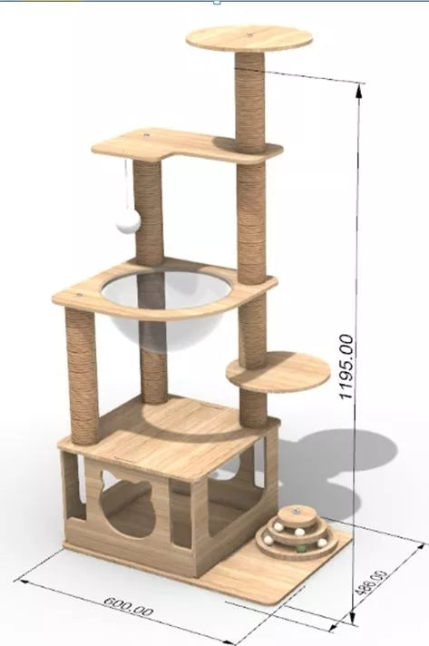 Suteikite savo katei tikrą pramogų, poilsio ir nuotykių pasaulį! Šis aukštos kokybės kačių namelis sukurtas taip, kad atitiktų visus jūsų augintinio poreikius – nuo aktyvaus laipiojimo ir nagų galandimo iki švelnaus poilsio tyliame namelyje. Natūralaus medžio spalva ir modernus dizainas puikiai įsilieja į bet kokį interjerą, o stabili konstrukcija užtikrina saugumą net labai aktyvioms katėms.