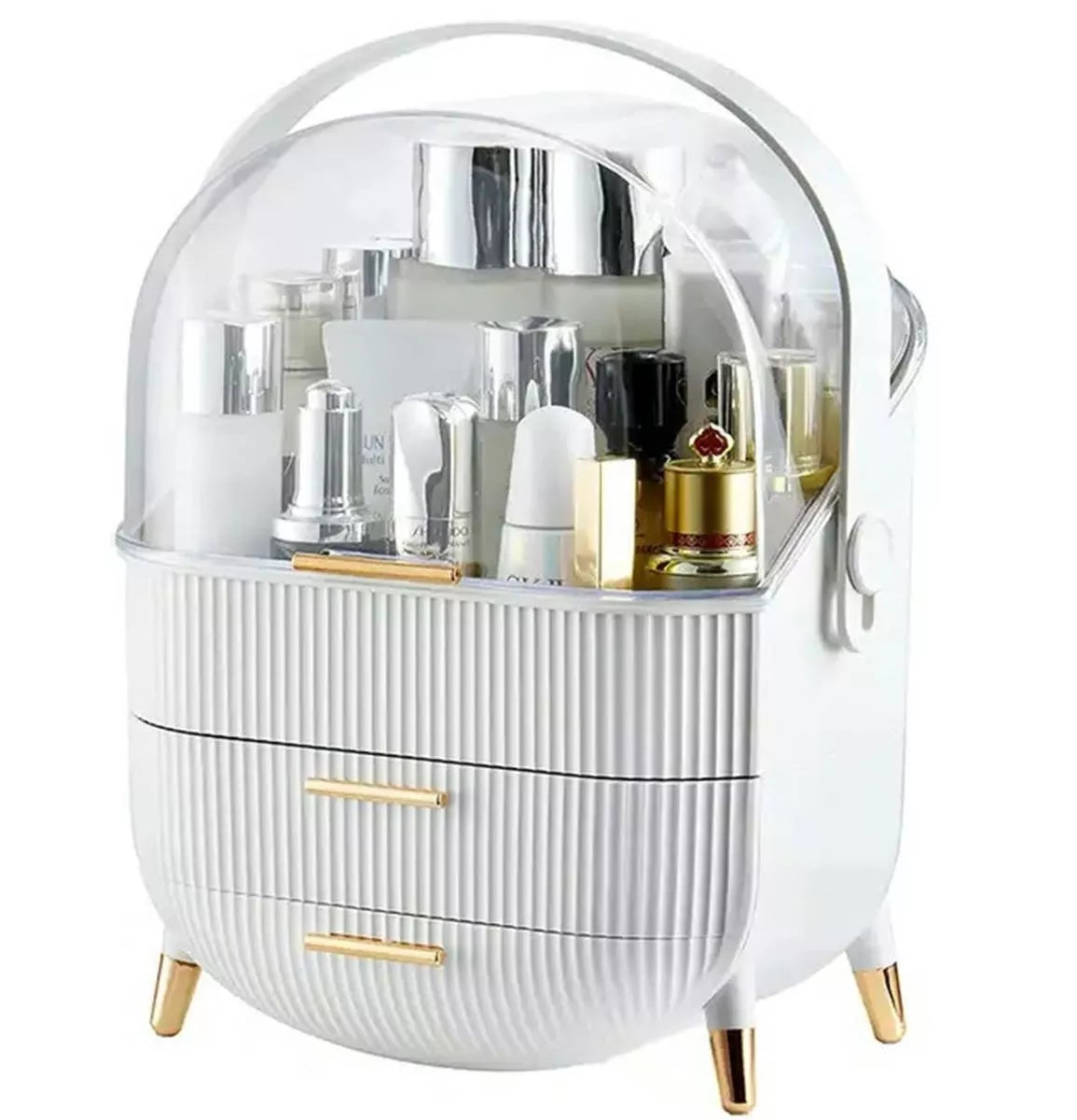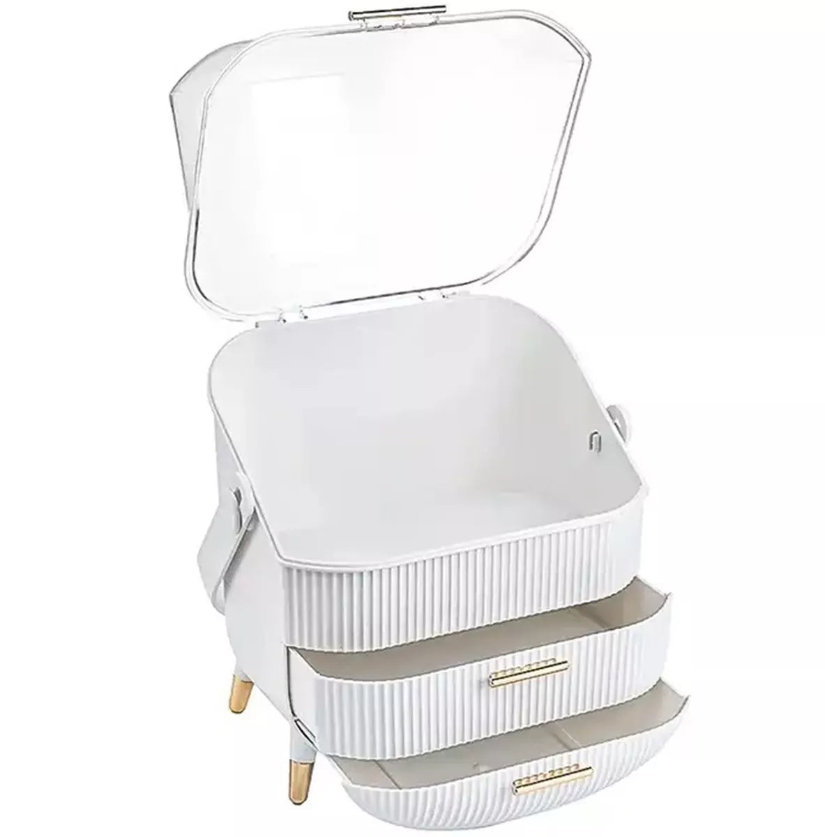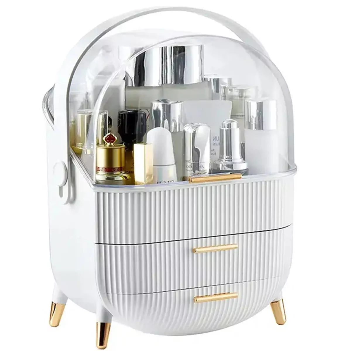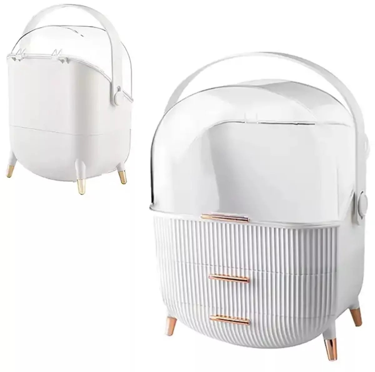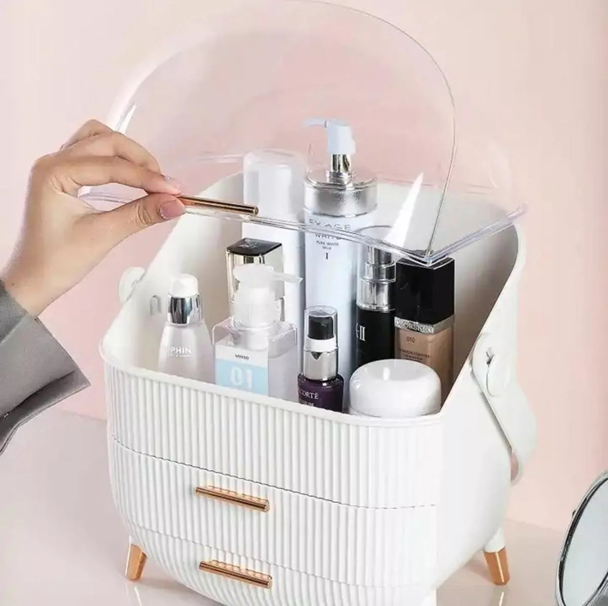 Praktiška ir estetiška kosmetinė su rankena. Įrengtas erdvus skyrius iš skaidraus akrilo ir du papildomi stalčiai smulkiems daiktams susidėti. Švelni balta apdaila spindi ir atrodo ypač prabangiai. Ją galima derinti su kitais baldais.