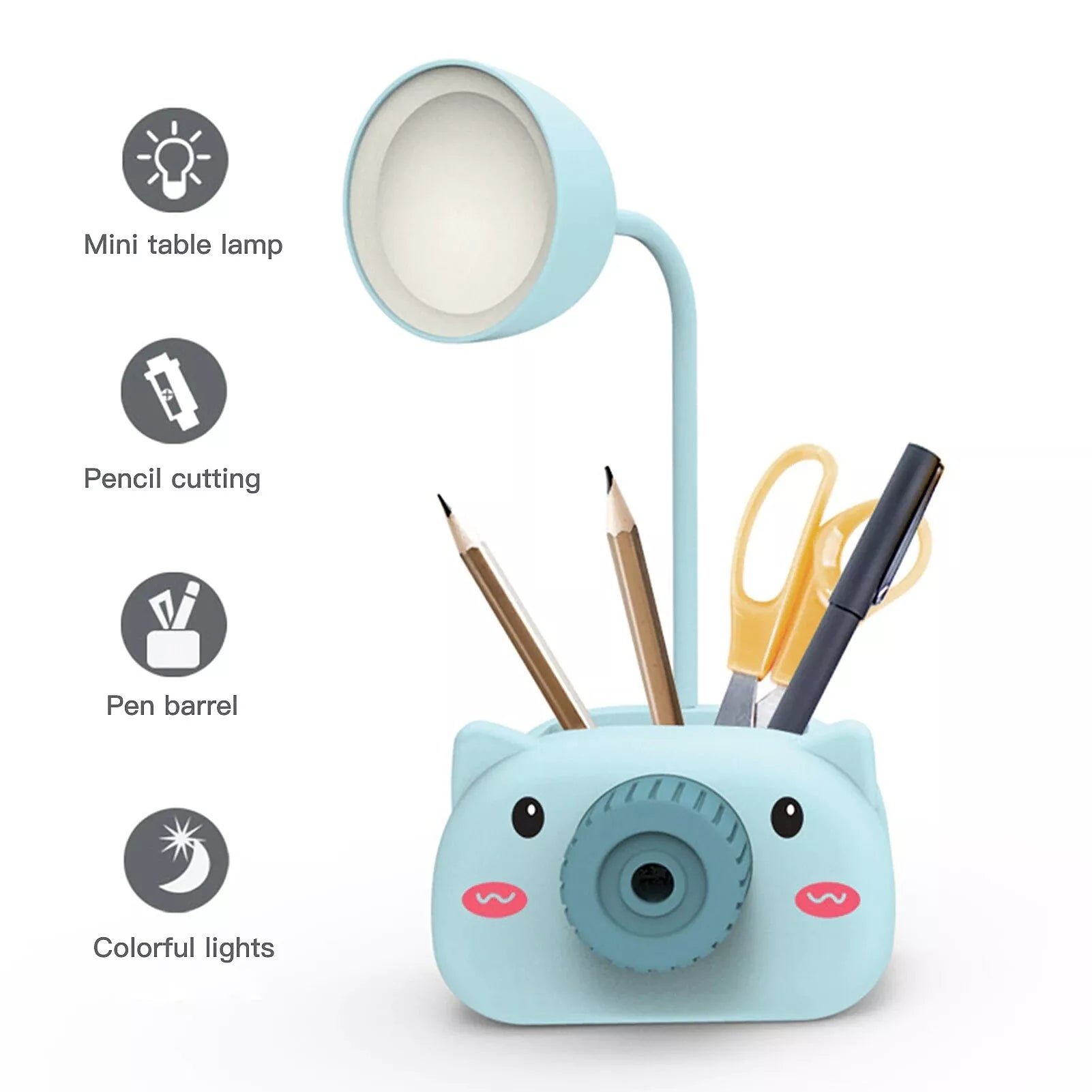 Kompaktiškas stalo šviestuvas su lankščia LED lempute.Įmontuotas pieštukų drožtukas.Galima naudoti kaip stovą telefonui.Įmontuotas akumuliatorius leidžią naudoti lempute net tada, kai nėra elektros.Techniniai duomenys: