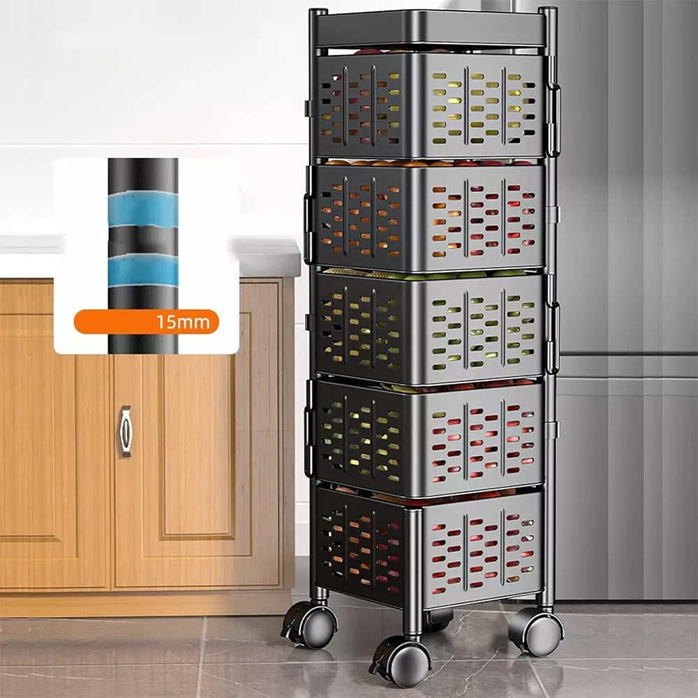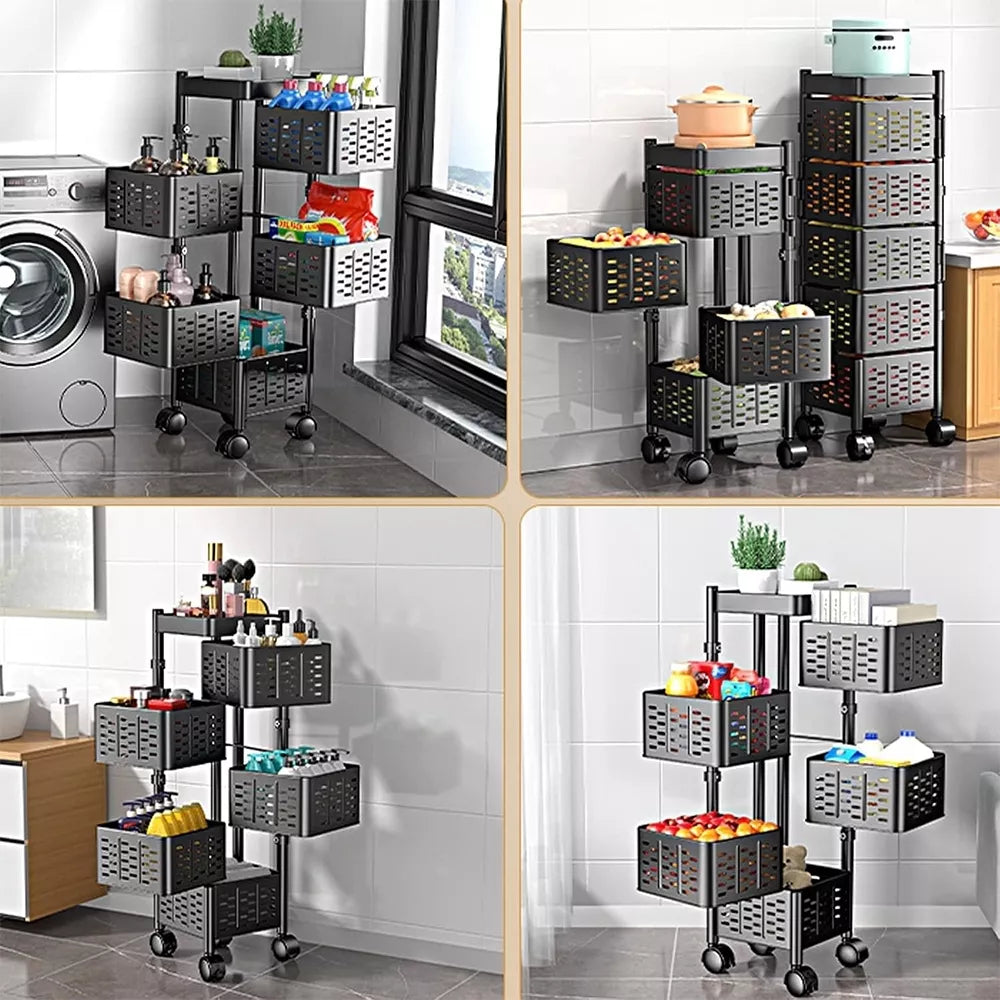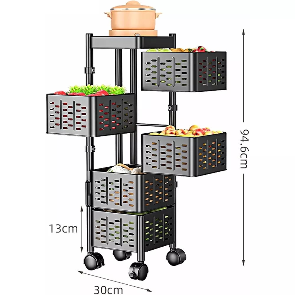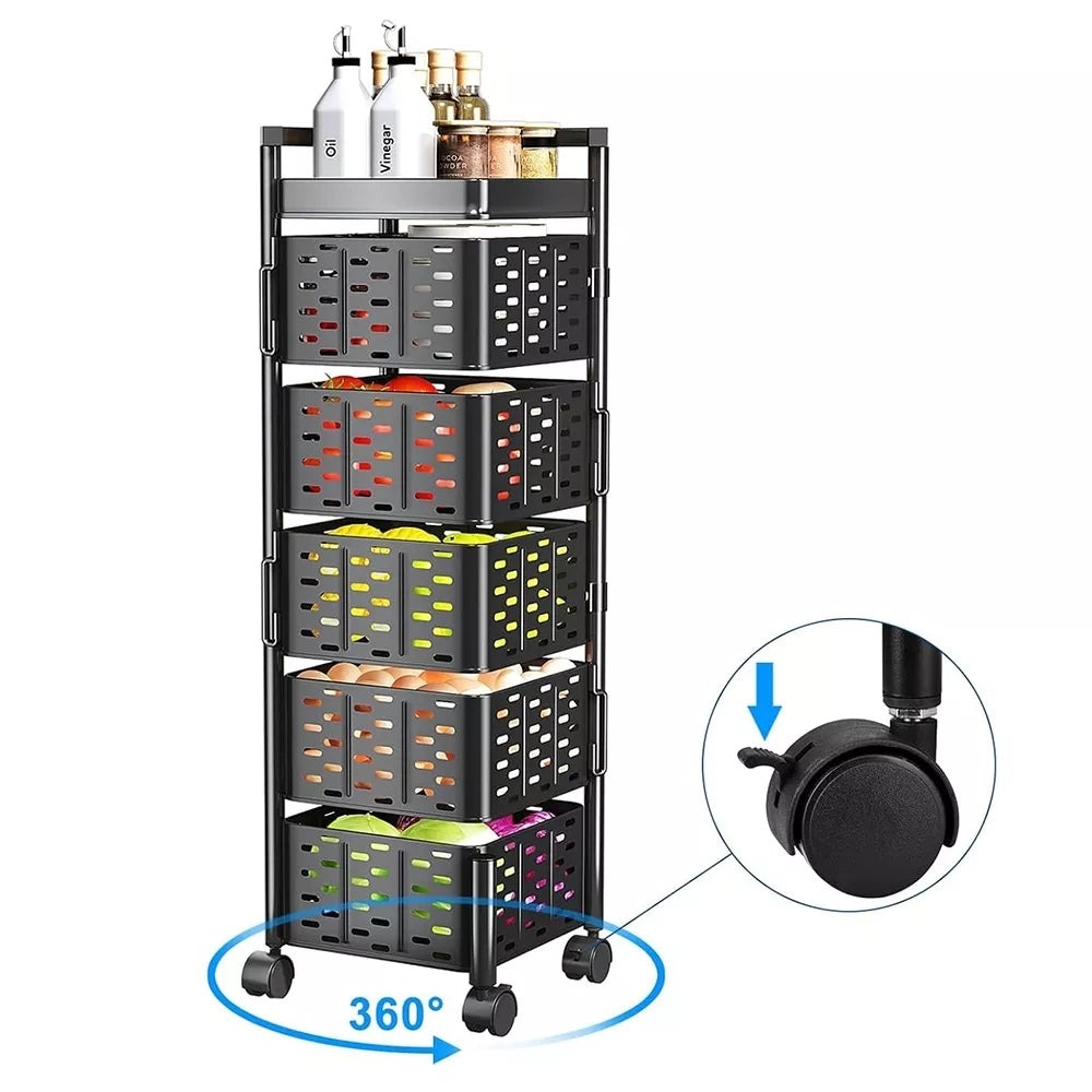 Ieškote praktiško, modernaus ir kompaktiško sprendimo savo virtuvei, voniai ar net kosmetikos priemonėms laikyti? Šis daugiafunkcis stelažas su 5 erdviais, pasukamais krepšeliais – tai universalus sprendimas, leidžiantis tvarkingai laikyti vaisius, daržoves, prieskonius, kosmetiką, valymo priemones ar net skalbimo reikmenis!