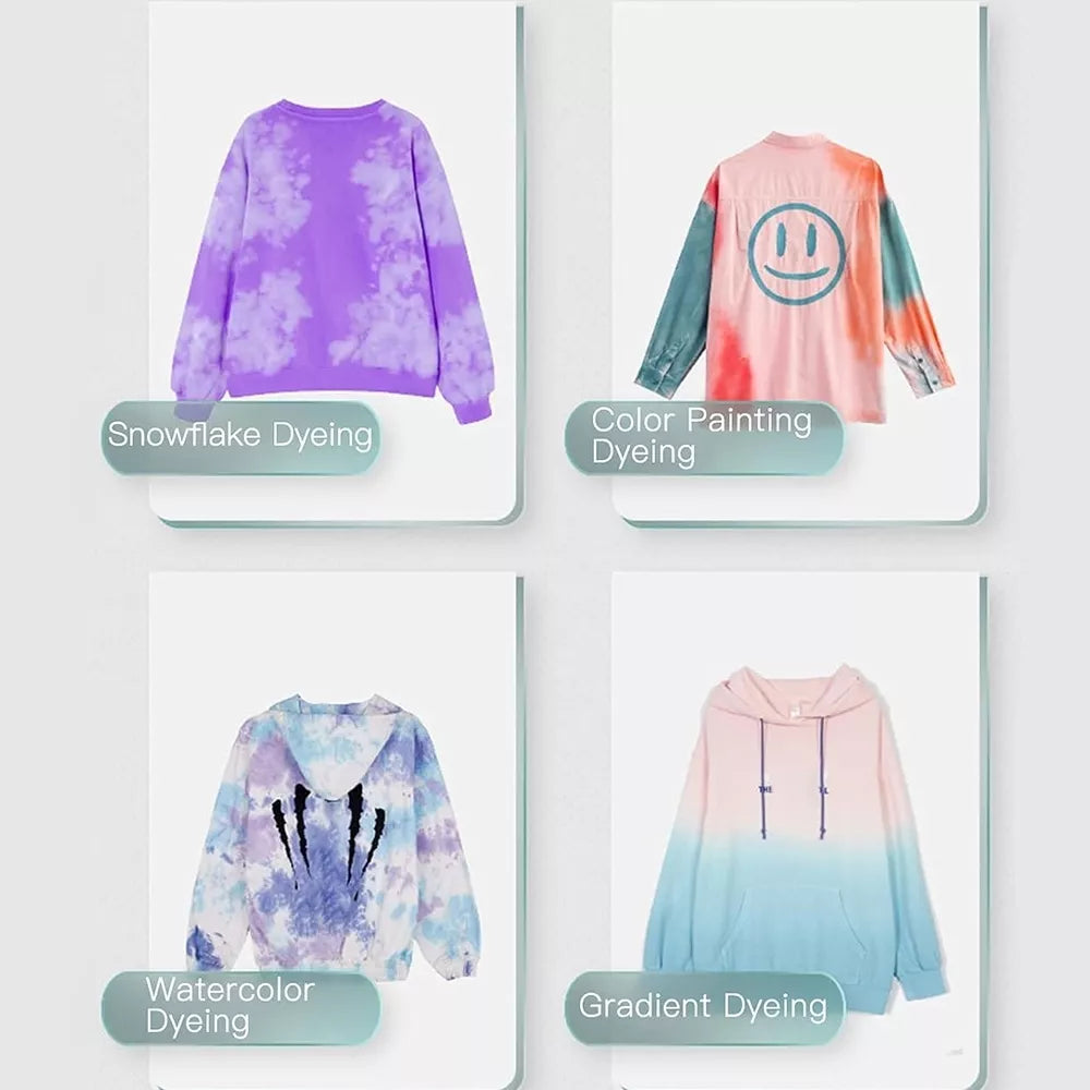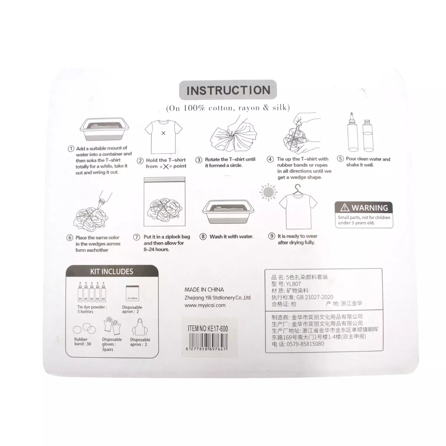 Sukurkite unikalius ir ryškius marškinėlius su šiuo „Tie-Dye“ rinkiniu! Rinkinys puikiai tinka 100 % medvilnės, viskozės ir šilko audiniams. Tereikia šiek tiek kūrybiškumo, o rezultatas – spalvingi, išskirtinio dizaino drabužiai ar aksesuarai.