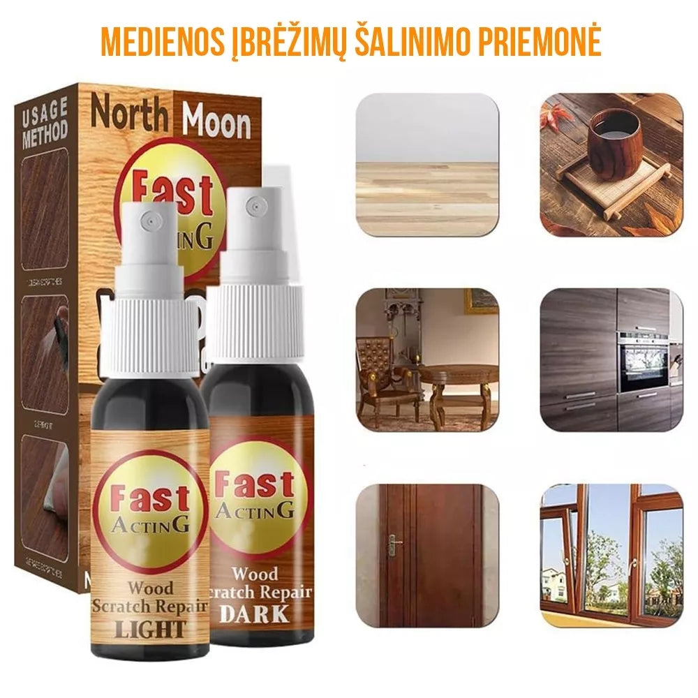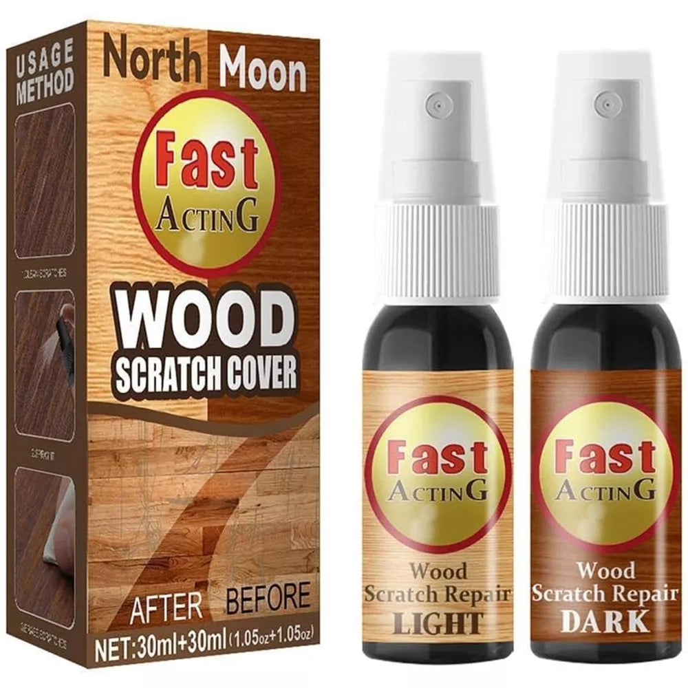 Atsinaujinkite be vargo su „North Moon“ medienos įbrėžimų šalinimo purškikliu! Šis greitai veikiantis dviejų tonų rinkinys (šviesus + tamsus) padeda efektyviai paslėpti įbrėžimus, dėvėjimosi žymes ir spalvos pokyčius ant medinių grindų, baldų, durų, spintų ar langų rėmų.
